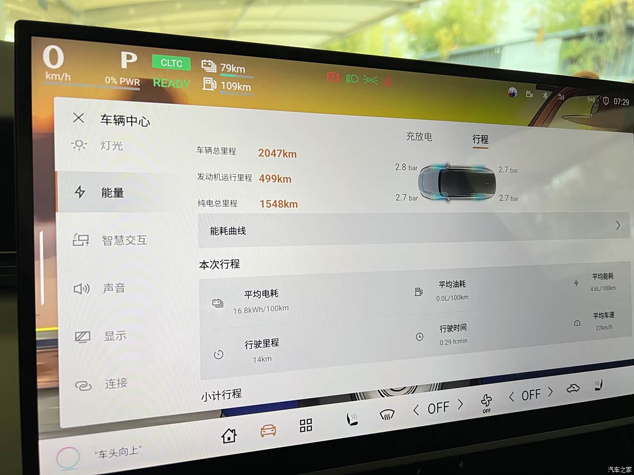 提车到现在1个多月,总里程行驶了2083km,其中发动机形式499km,纯电行驶1584km,整体平均电耗12.6kwh/100km,平均能耗5.1L/100km,油耗1.6L/100km,整体还是很满意的。