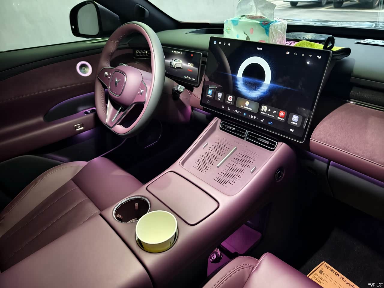 外观紫色很美观,典雅,车灯和车标也有识别度,晚上灯光很酷,很大气。隐藏式门把手使得车身看起来更简洁不少,停车后也能自动打开,很方便。大轮毂运动造型很好看,跑起来很拉风。