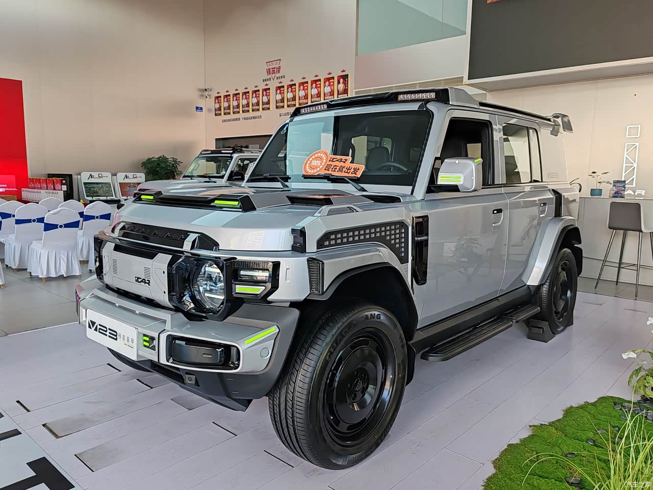 爱咖这个车外观还可以,类似越野车方方正正的造型,也就是现在所说的方盒子造型,前大灯开着有点和212神似,后面的小书包很有个性,现在很多车都有这种类似小书包的造型,外观整体看起来还不错,像很多越野车具有的方盒子造型、踏板等元素这个车都有,另外这个车的改装套件很丰富,我看的这个车就是店里改装的车,相当有个性,改装完非常完美。我很喜欢这个车的门把手很个性。