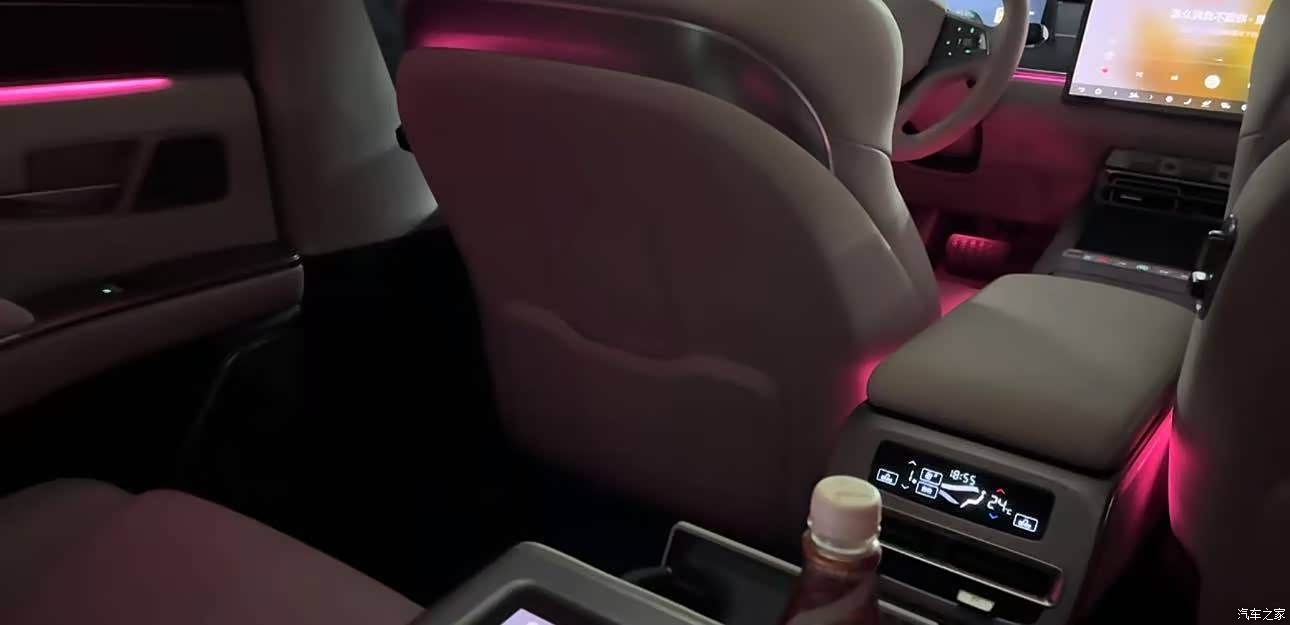 大面积皮质包裹和氛围灯提升了档次感。中控屏幕尺寸巨大且可旋转,但部分高频操作未保留实体按键,需要适应。双色搭配和木纹饰板营造了不错的豪华氛围。