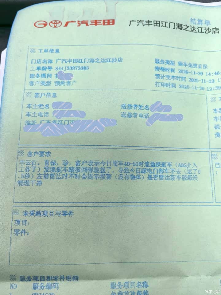 11月28日下午,下班回家路上比较多车,我也开得不快,大约40-50时速,离前车大约8-10米。 走着走着前车被加塞急刹,我立刻急刹,刹车离奇重,ABS都出来了,然后前车往前走,我立刻把刹车的脚抬起来,(重点来了)刹车没有立即回弹,同时另一只脚踩电门没反应(完全停在路上)……很快就听到嘭的一声,被后车追尾了…… 下车一看,女司机。。。丰田的质量还是不错的,只是掉漆了。只能女司机全责了……约好第二天走了快速处理。 第二天去了交警那边拍照拿单据后,立即开过去附近的4S店喷漆补漆。顺便做首保。已经告知他们刹车有问题。 一周后去取车,跟我说没检查出刹车有什么问题……说检测员不敢开到50急刹测试,还说这是极氪也有的问题,前面有障碍物,车机识别会刹停……(我完全没开智驾,车上的辅助功能我几乎都关了) 我这车的主要问题是,刹死了,踏板回弹不及时啊!!! 幸亏当时后车不是水泥车平板车。 平时驻车启动的时候,踩一下刹车启动,偶尔会听到弹簧延迟回弹,弹簧回复的“嗒”一声。