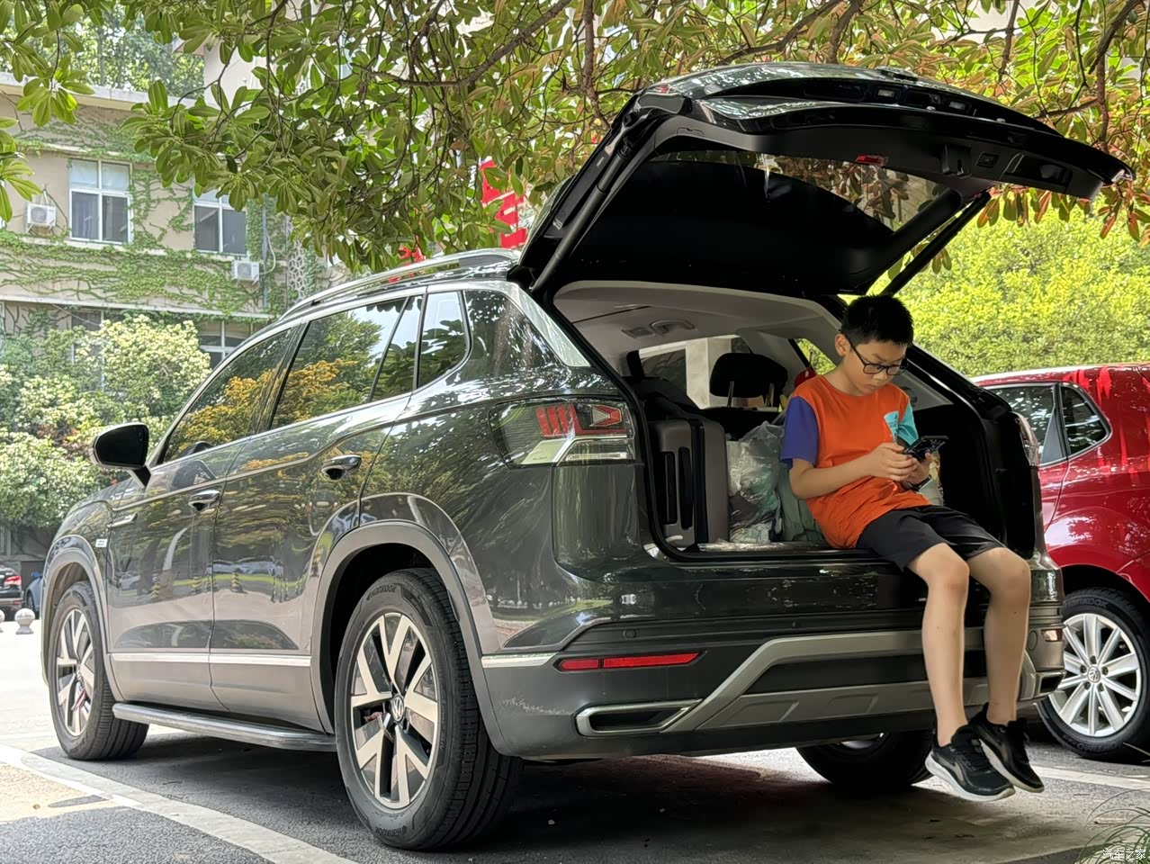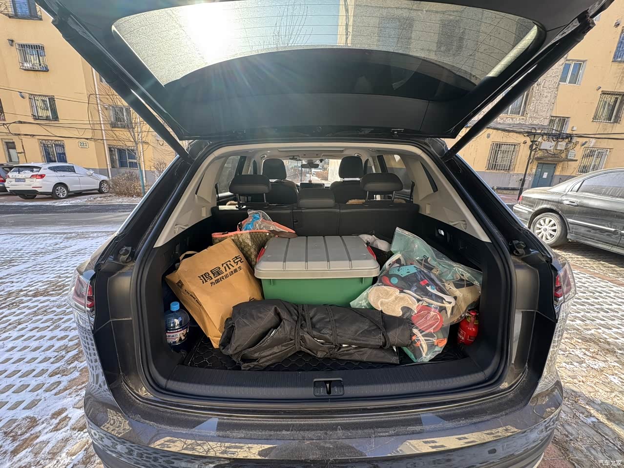 作为家用SUV,探岳的空间表现真的没话说。我身高178cm,坐在驾驶位调好座椅后,头部还有一拳多的余量,不会觉得压抑。后排空间更是惊喜,上次带两个朋友出去玩,他们坐在后排,腿部能轻松翘二郎腿,横向宽度也够,三个人并排坐完全不挤。后排还配备了独立出风口和双USB接口,朋友都说坐我的车很舒服。储物空间设计也很贴心,前排的小储物格能放眼镜、手机,扶手箱里能塞下好几瓶水,门板上的储物槽也够大。后备箱常规容积506L,平时放孩子的推车、购物袋绰绰有余,周末去露营,把后排座椅放倒,帐篷、睡袋、烧烤架全都能装下,实用性拉满。