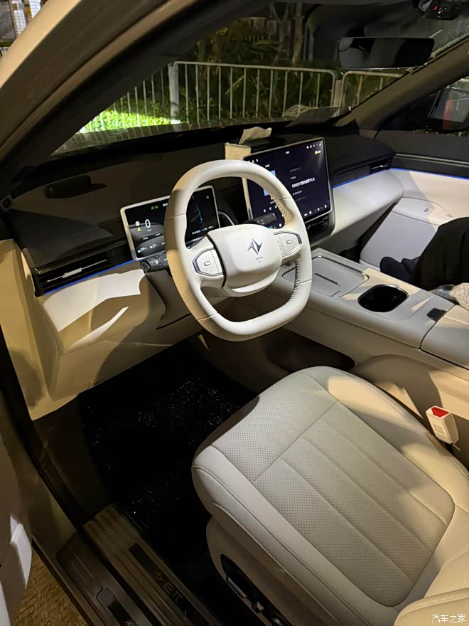暖山玉白的内饰软包覆盖率较高,几乎摸不到硬塑料,看着很大气,但是前排座椅地下的空调出风口是塑料件,且全白的内饰有点怕脏所以只能给到3分