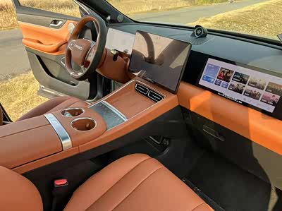 内饰三块屏幕比较讨喜,尤其是副驾屏幕,长途行车的时候看个电影还是不错的,皮质包裹用的比较多,触手所及的地方基本都是软性包裹,座椅很舒适,坐上去可以明显感受到座椅表面那一层很软很舒服,而且回弹很好,可以感受到座椅上方腿部衬托做得很好,
