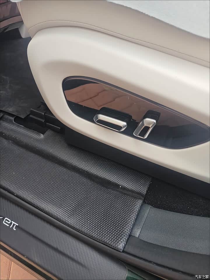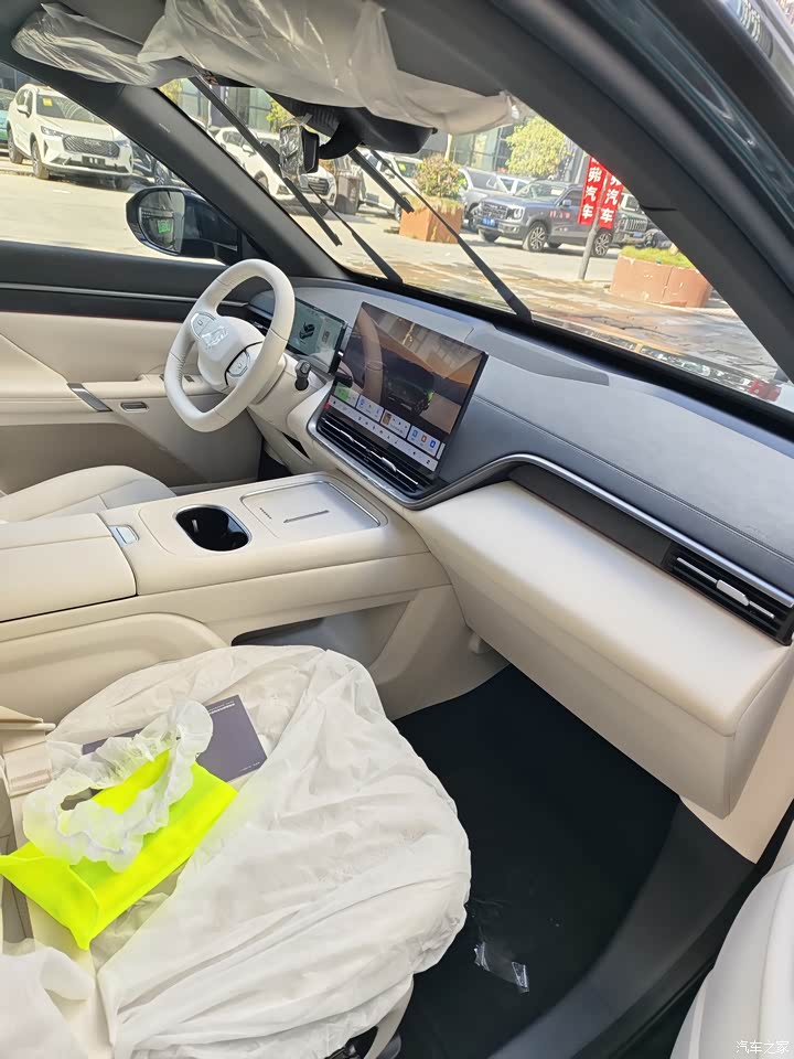 内饰米色是家里人选的,坐进来亮堂,软包面积大,观感和触感都偏温和,浅色的特点就是需要勤快打理,家里有小孩手上有零食饮料,备点清洁湿巾放车里更省心,座椅官方叫云感亲肌,摸上去软,坐垫和靠背对身体的承托做得均匀,提车头两周鼻子能闻到一点皮质和胶水味,通风多开几天散得差不多,细节上个别内饰接缝对齐没做到完全齐整,站近了看能找出小瑕疵,结合价格看在能接受的范围内。