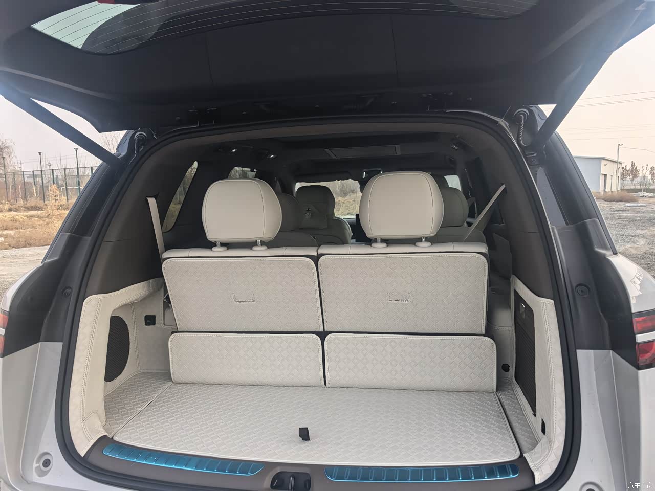 空间表现是腾势N8L的核心优势,“超豪华移动大平层”的定位名不虚传。3075mm的轴距带来了不一般的感受,实现了三排乘坐都非常宽敞、舒适的体验。本人身高170cm,在前排调好驾驶位后,头部仍有两拳左右余量,第二排独立座椅前后滑移距离达100mm,腿部空间最宽时超过两拳,第三排坐进去膝盖前也有两拳空隙,完全不像传统7座SUV的“应急第三排”。全家六口出行时,无论是老人还是孩子都能找到舒适姿势,121°的座椅调节角度让长途乘坐也不会疲惫。储物空间同样出色,49处收纳格+51L隐藏式储物盒,手机、水杯、孩子的玩具等物品都能各归其位,常规状态下的后备箱能轻松放下两个28英寸行李箱+折叠婴儿车,放倒第三排后更是能容纳露营装备等大件物品,满足储物需求。