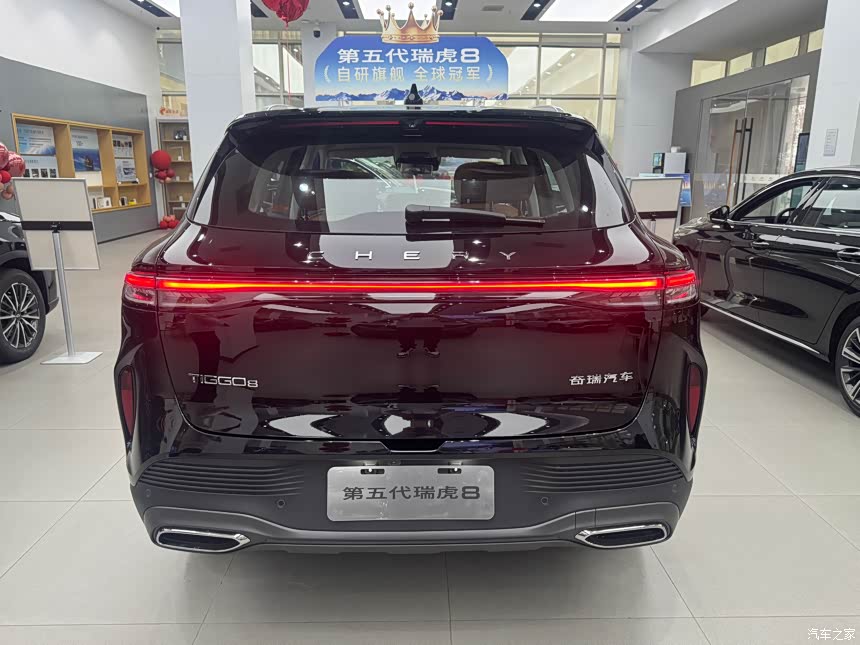 第五代瑞虎8在车身尺寸方面比我的老虎8都有所增加,特别是轴距方面,由原来的2710变为2825,单从轴距这一个数据就可以说明,瑞虎8是真正的迭代,而不是改款,新虎8给我的感受:更精致、更科技、更运动。 前脸部分,第五代瑞虎8分为虎脸和豹脸,今天我们体验的是虎脸,最明显的特征就是“大嘴”,大尺寸的进气格栅,里面布满了一颗颗尖利的虎牙。两颗闪闪发光的“虎瞳”炯炯有神。 车身轮廓保留了瑞虎8作为中型SUV的稳重、大气的体量感,和我的虎8最大的区别就是C柱位置,老虎8方正硬朗,新虎8更加圆润流畅。19寸多辐双色轮毂非常动感。 贯穿式尾灯已经成为现下流行的设计元素,第五代瑞虎8的贯穿式LED灯带,内部灯腔结构精致,点亮后科技感和辨识度极高。后保险杠造型饱满,采用双边共两出的真排气口,显得扎实有力。