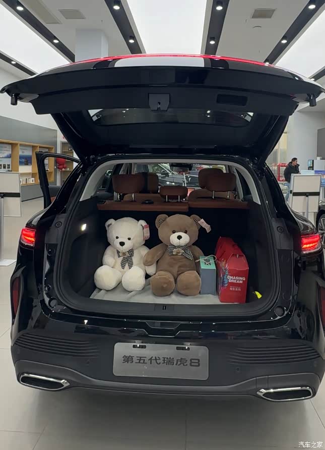 空间是第五代瑞虎8和前面几代相比变化最大的地方,轴距增大是最明显的特征,2825mm越级轴距带来了同级车无与伦比的乘坐空间,我身高178厘米,前排调整到我合适的驾驶位置,后排腿部空间竟然有3拳左右的距离,可以轻松翘起二郎腿。官方宣传,后排座椅放倒,能得到一个3.3平方米的私人移动空间,秒变大床房。 后备箱标配电动尾门,内部空间足够家用,而且还是双层设计,搁板下面还有一层隐藏设计,可以藏藏私房钱。