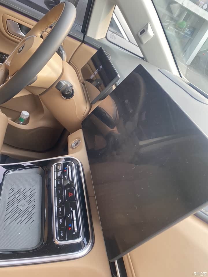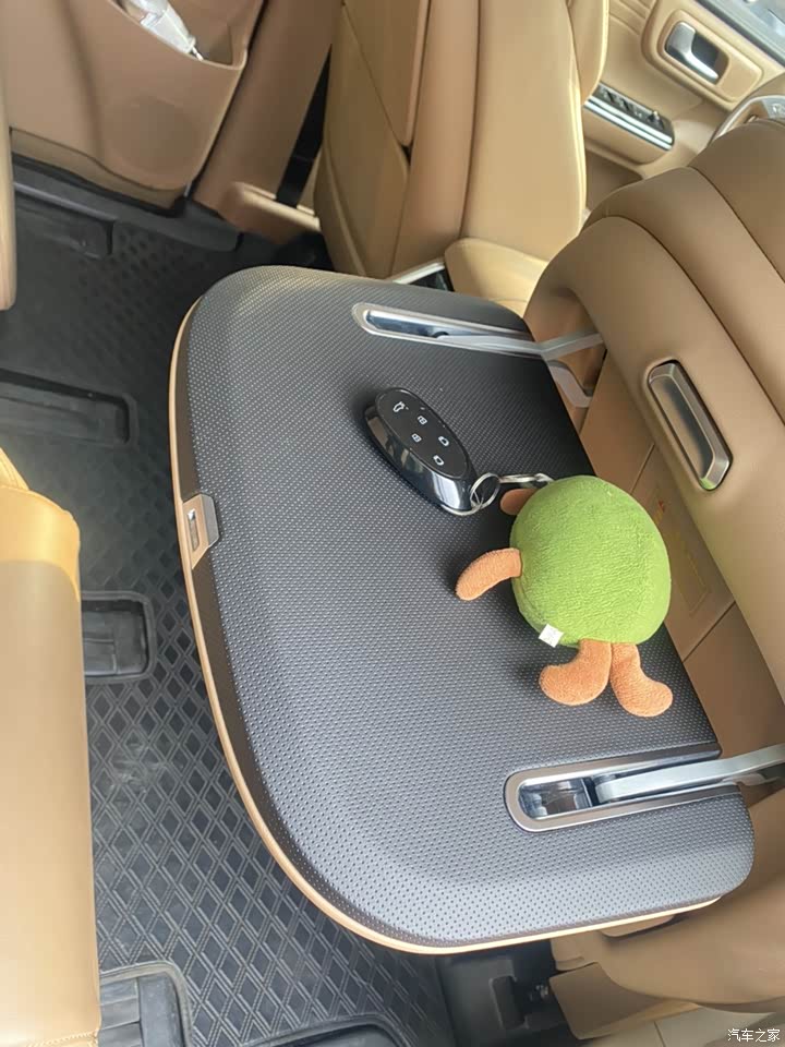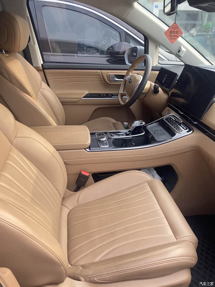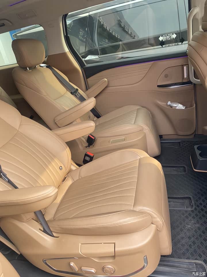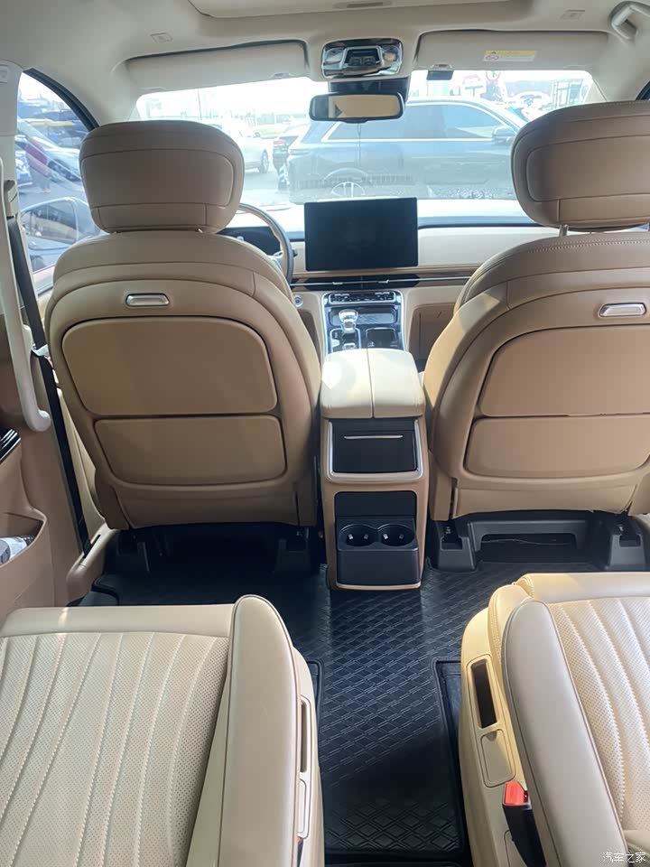 内饰算得上是简单,抛去门边那些材质有点拉垮外,其他配备还是很高大尚的,前面的大显示屏就像个电视,座椅都是皮质材质,乘坐舒适度还是挺不错的,特别是第二排,老板座椅,独立的,还有通风、按摩、退托等功能,前面还有个小桌板,平时出差办公,放点东西都很方便,车内还有多个小储物格,手机、钱包等小物件收纳整齐,实用性拉满。