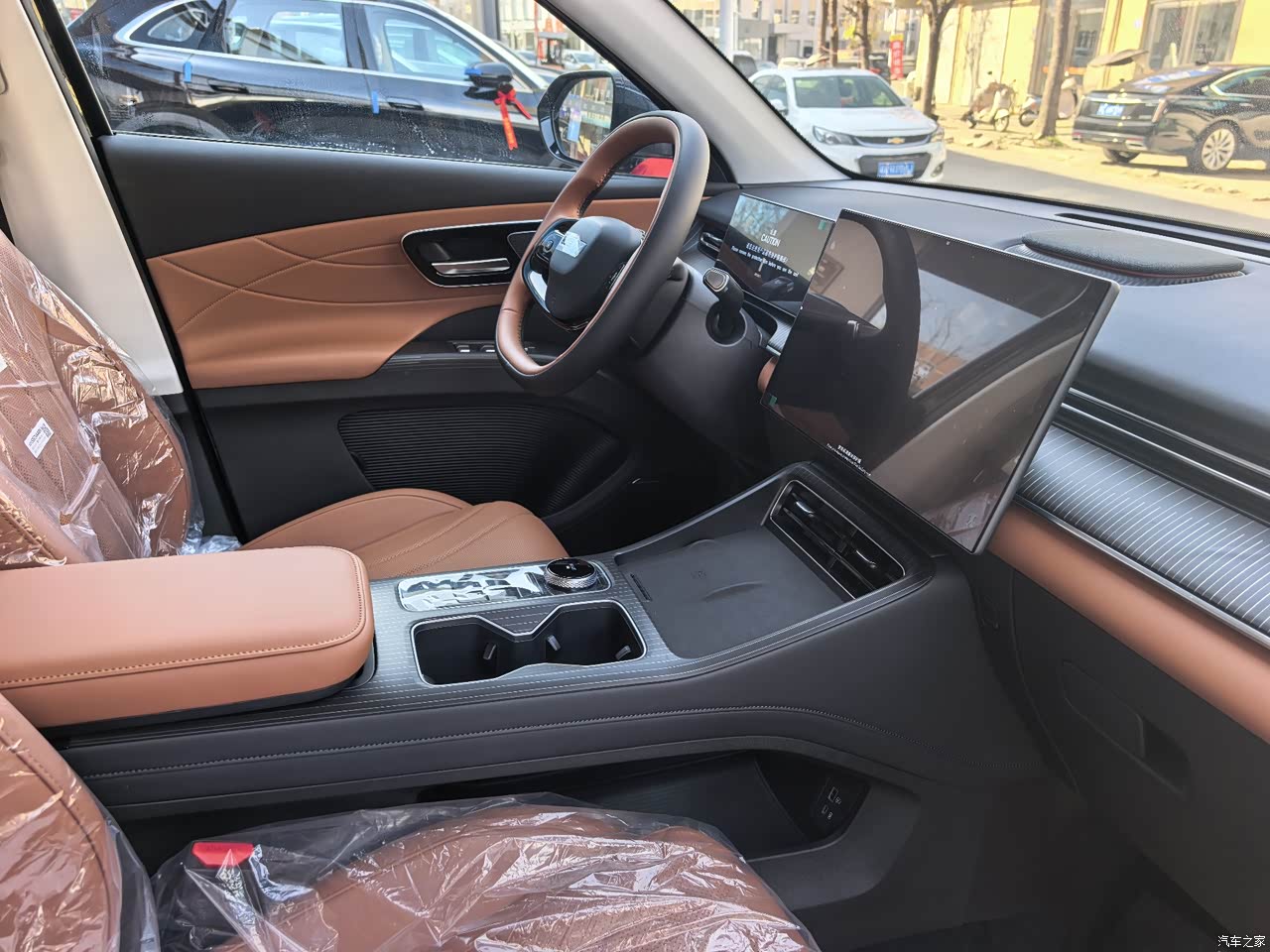 尊贵型内饰在设计和材料。用料都还可以。采用的是琥珀棕内饰。整体设计了居家风格。中控台采用分层式设计。15.6英寸悬浮式横置中控屏。全系采用了8155芯片。尊贵型车型还有多色氛围灯。晚上开车听音乐的时候比较舒适。