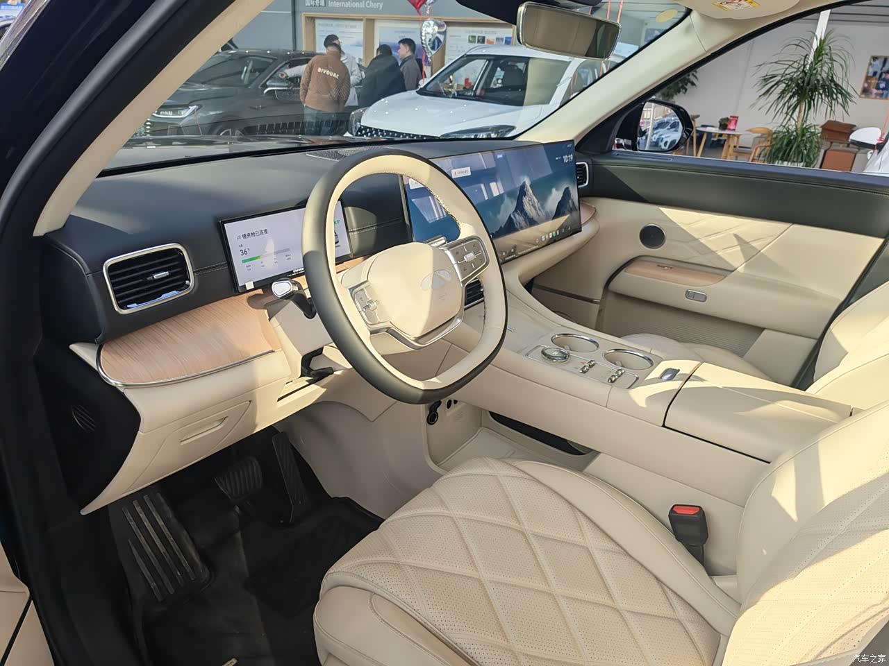 初见风云T11,5.2米的车身搭配硬朗线条,气场不输豪华品牌1。内饰以米白与黑色为主色调,大面积麂皮材质包裹,中控台可移动大屏轻推即滑出,科技感十足1。30英寸6K大屏操作流畅,语音控制“小奇”响应迅速,连后排娱乐屏都能语音操控6。