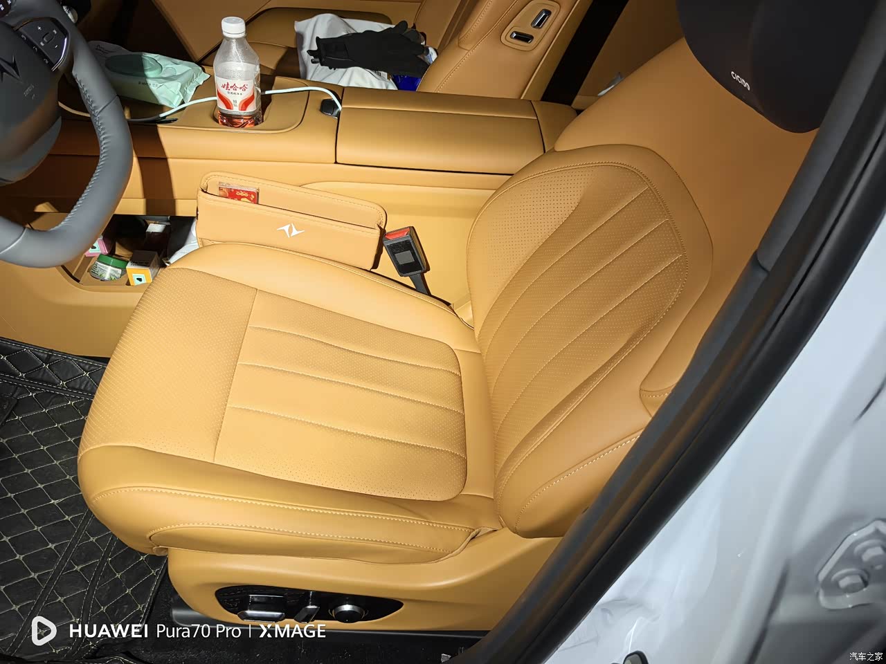 内饰是棕色,官方叫暖山棕,软质包裹和木纹饰板把氛围往居家的方向拉,手能摸到的地方多是亲肤材质,官方说全车用了十八平方米,新车提回来的那几天,我把车停在楼下晒了会儿,打开车门没有刺鼻气味,十五点六中控屏是视觉中心,显示清楚,操作这块还可以再打磨,氛围灯六十四色随便调,晚上坐在车里灯光柔和,整车给人的状态是放松温暖。