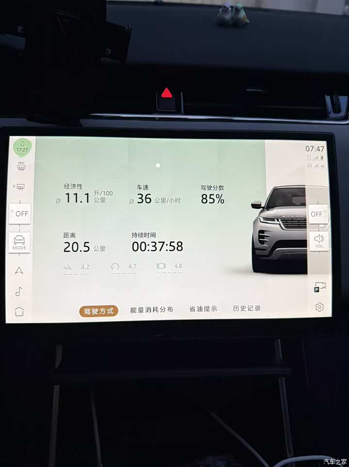 油耗从来不是路虎的强项,所以期望不高。第一趟行程平均车速36,油耗11.1。我那两台2.0T的C级轿车同样的工况也要10.5-10.9,极光比他们重2,300公斤,这个油耗还算可以接受。有空跑个高速再看看