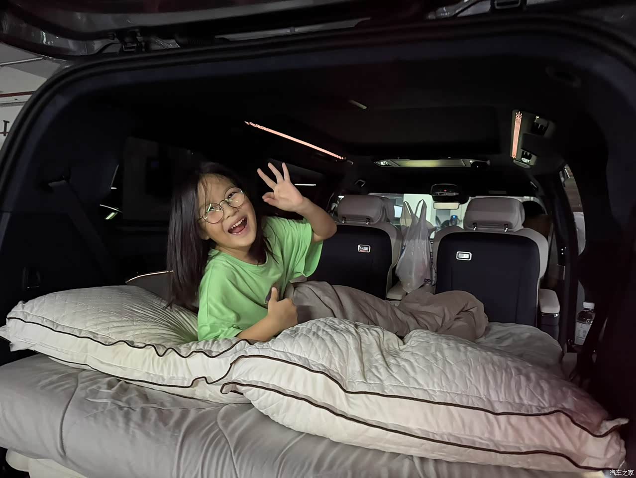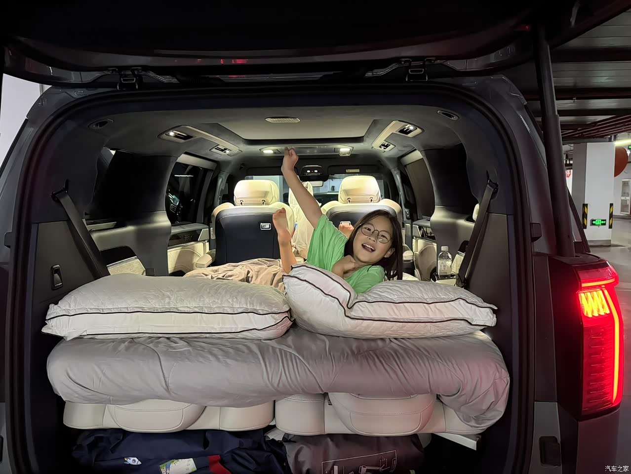 *关于床车:刚提车我就网上定制拉丝床垫啦,一家三口(女儿7岁还小能睡得开)窝在车里看电影,唱K,自驾游时还能想睡就睡,不用被酒店到景点的距离而束缚。晚上全景天窗满天星,清晨暖阳唤醒依山傍水竹林间。 *关于后备箱收纳:为了功能多样化节省空间,我买的置物箱高低是可以床车时垫第二排空档的,收纳的物品也是常用露营生活用具,每次出行都在精简我们的装备,完美利用车内空间。 *关于座位空间:我老公开车多,前排和二排座椅都支持加热、通风、按摩、记忆功能。我和女儿坐二排享受零重力座椅 ,她喜欢开着加热按摩躺着看电视,看文字都感受到她的舒适了 ,冰箱冷热双享、水饮自取,隐藏式小桌板可以放零食、放置平板和手机。座椅调节,小孩玩的比我溜。 车子满座6人的情况下 三排舒适度尚可 不会觉得很拥挤。