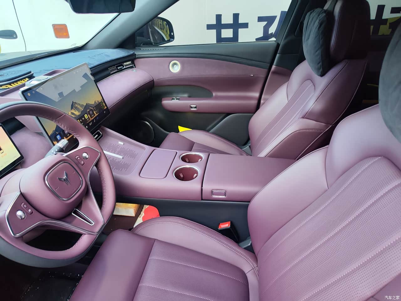 那内饰的紫色简直太合我心意了!其官方名称为琉璃紫,在实车呈现的状态下,并非那种颇为浮夸的亮紫色调,而是一种偏向于深色且富有质感的紫色,随着光线的不同,还会有细微的层次变化出现,再搭配车内的皮质包裹以及金属饰板,瞬间便营造出满满的豪华感。中控台用手去触摸的时候,感觉软绵绵的,绝大多数的地方都采用了皮质材料,就连缝线处理也十分工整,新车基本上没有什么异味,这一点确实值得大力夸赞一番。