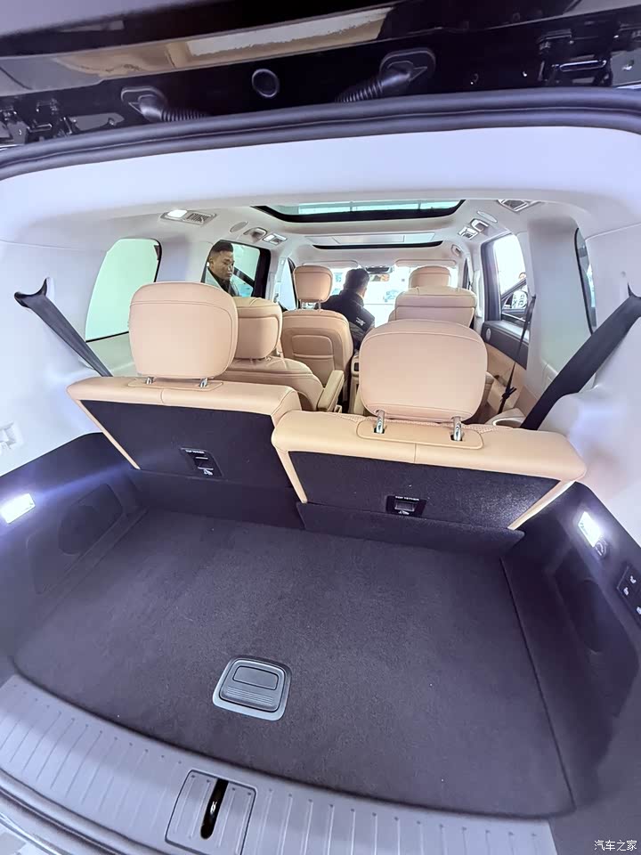 车身看着就大,内部轴距够长,采用2+2+2的六座布局,每一排都能坐得舒展。前排调整好坐姿后,180cm的人坐进去,头部还有一拳多空间,开车时不会觉得顶头。第二排是独立座椅,特别宽敞,还能调靠背角度,腿托升起来几乎能平躺,坐久了也不累,中间过道够宽,不用挪前排座椅,老人孩子就能轻松走到第三排。 第三排可不是凑数的“小板凳”,178cm的成年人坐进去,腿部还有两拳余量,头部也不压抑,短途坐完全没问题,长途也不会太憋屈。而且三排都有充电口和杯架,手机充电、放水杯都方便,细节挺周到。
