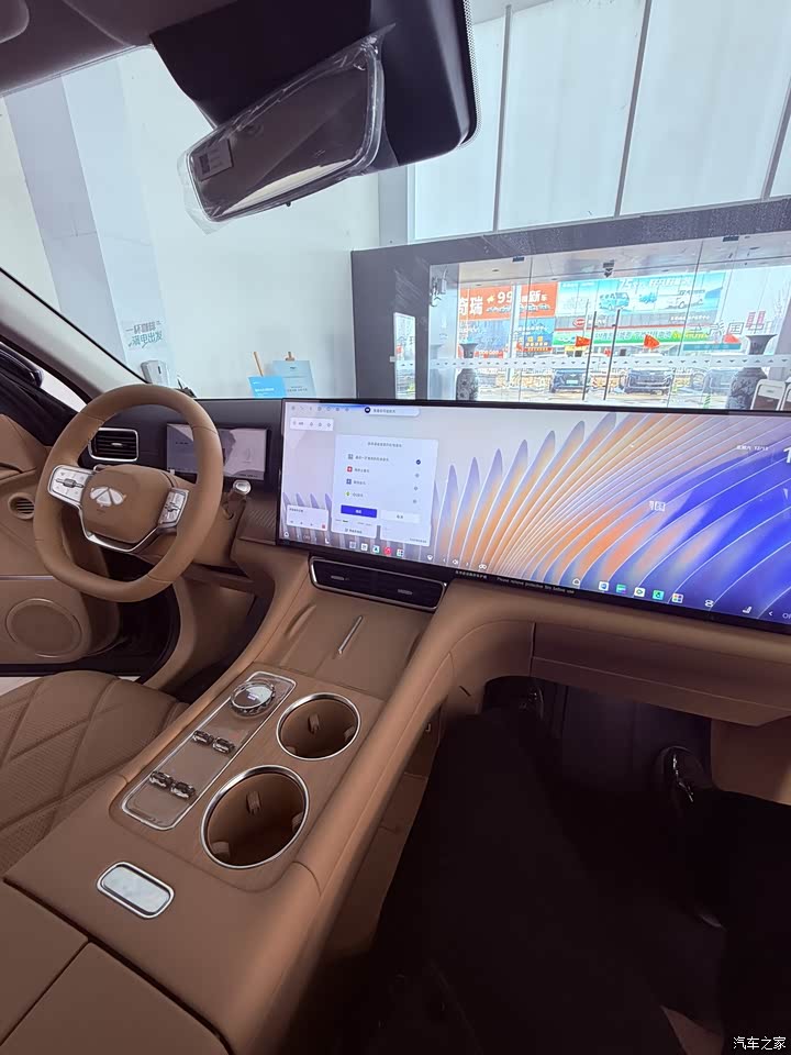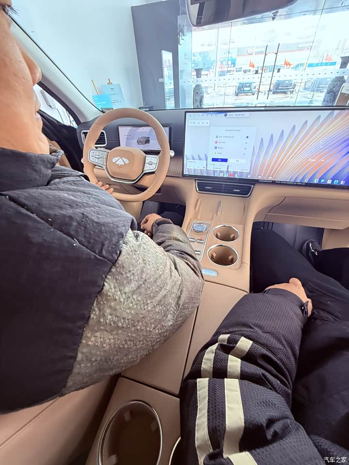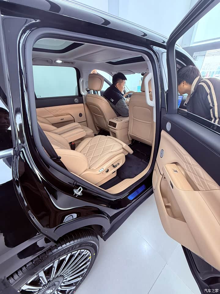 它的座椅材质很不错,采用了对标迈巴赫的Nappa工艺处理,荔枝纹纹理很细腻。座椅是米棕撞色的,看着很温馨,而且是母婴级环保材质,通过了欧盟REACH认证,新车基本没有异味,家里有老人孩子也能放心乘坐。前排主驾座椅有14向电动调节和4向腰托,能找到很舒适的坐姿,还有加热、通风和按摩功能,开车的时候能很放松。第二排是独立航空座椅,有电动腿托,还能调零重力模式,就像家里的沙发一样舒服,扶手内侧还有折叠小桌板,孩子可以在上面写作业、吃零食。第三排座椅也不简陋,软质填充很足,坐着不会觉得累,还有加热功能和充电口。