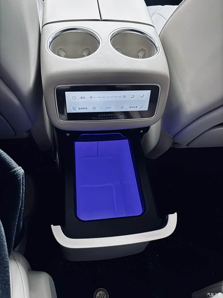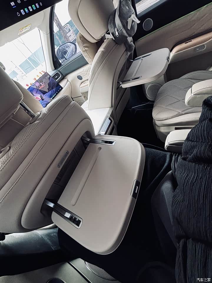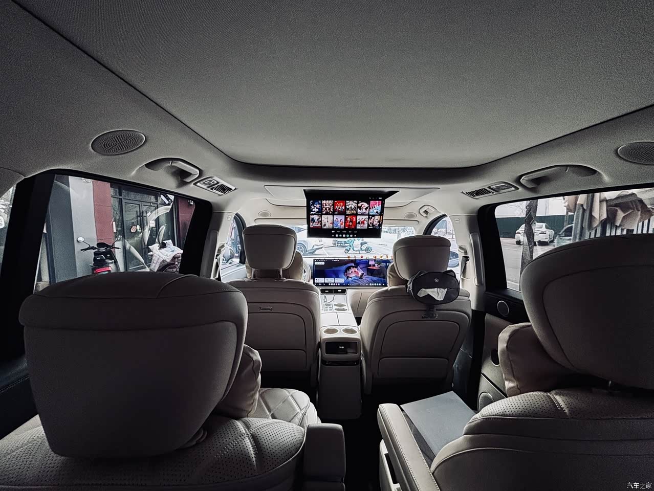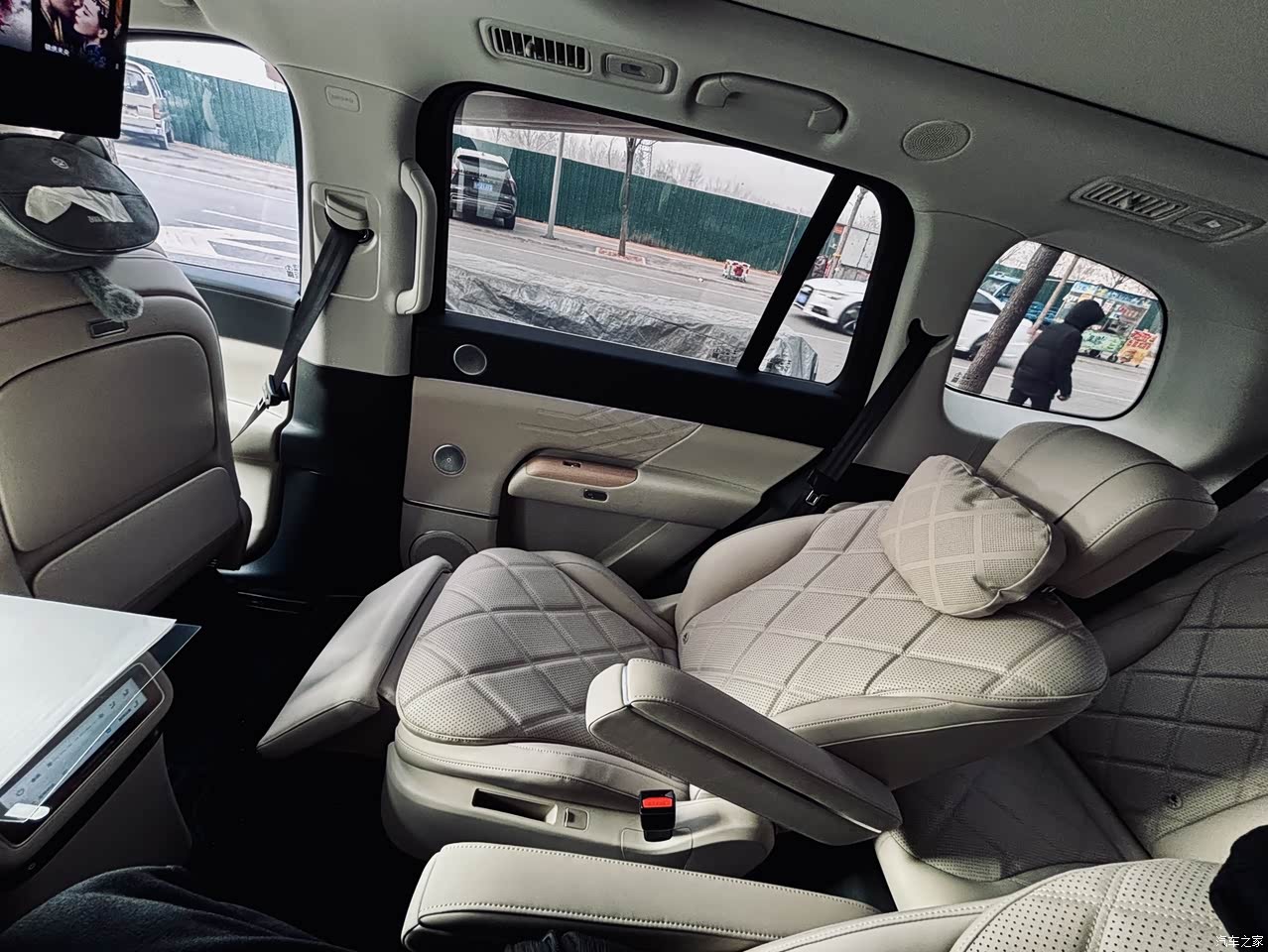 车内大面积采用Nappa级真皮全覆盖:方向盘、中控台、座椅、门板,告别硬塑料感,能摸到的地方几乎都是软的,摸起来非常细腻。座椅的打孔缝线都是双缝线,豪华感十足。座椅相对来说偏硬一点,不过我和我老婆都可以接受,坐久了也是很舒适的,第二排零重力座椅,确实很爽,看电视很给力,就是如果是双零重力座椅的话就更棒了。