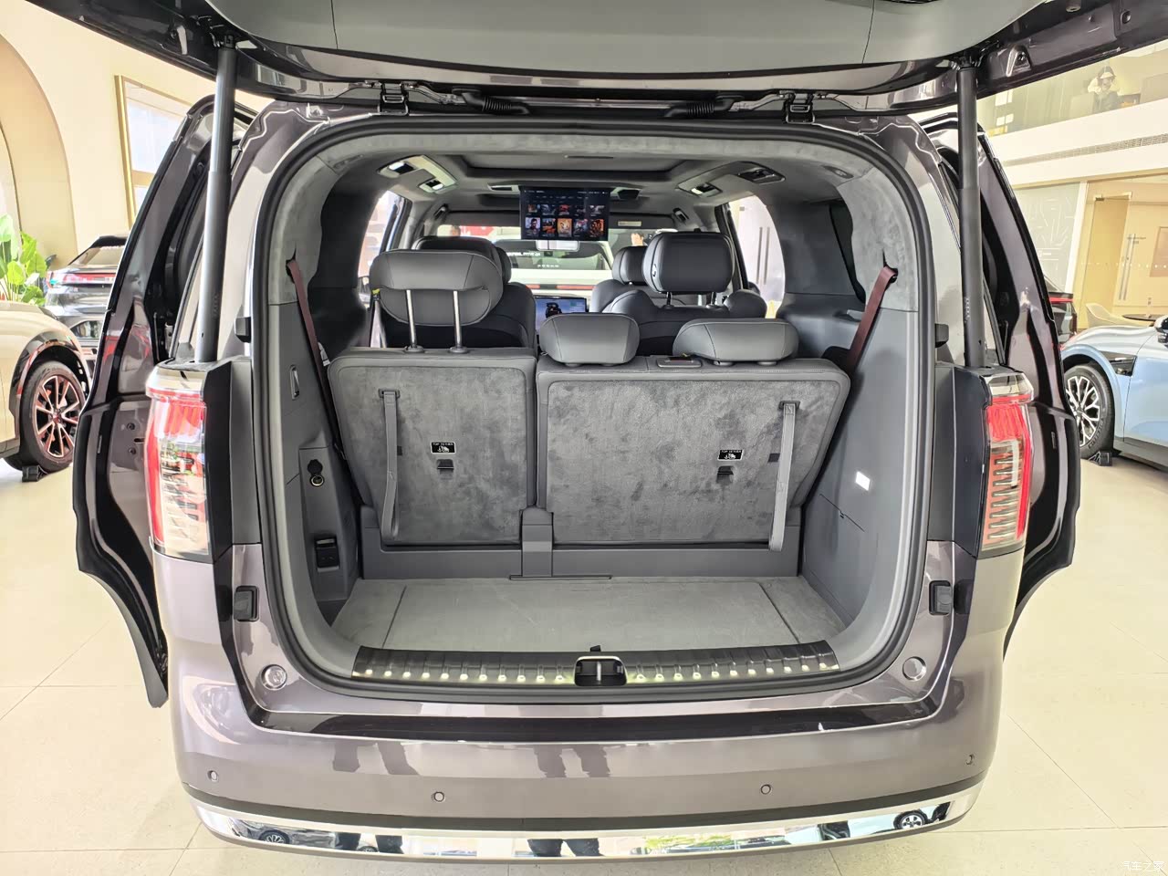妥妥的移动大平层,非常满意。第二排优秀,正常距离下都可以翘二郎腿,更别说滑到最后,绝对是商务舱的感受,中间过道空隙够用,正常上下没有问题,而且最后一排一般不会坐胖子和老人。前排才是我的归宿,目前只有司机的命,不过还算宽敞。我175的身高,有这个效果日常够用,我家小孩最喜欢这个位置。后备箱空间看着很大,销售说可以放下6个24寸行李箱,如果第三排放到拉货也没问题。