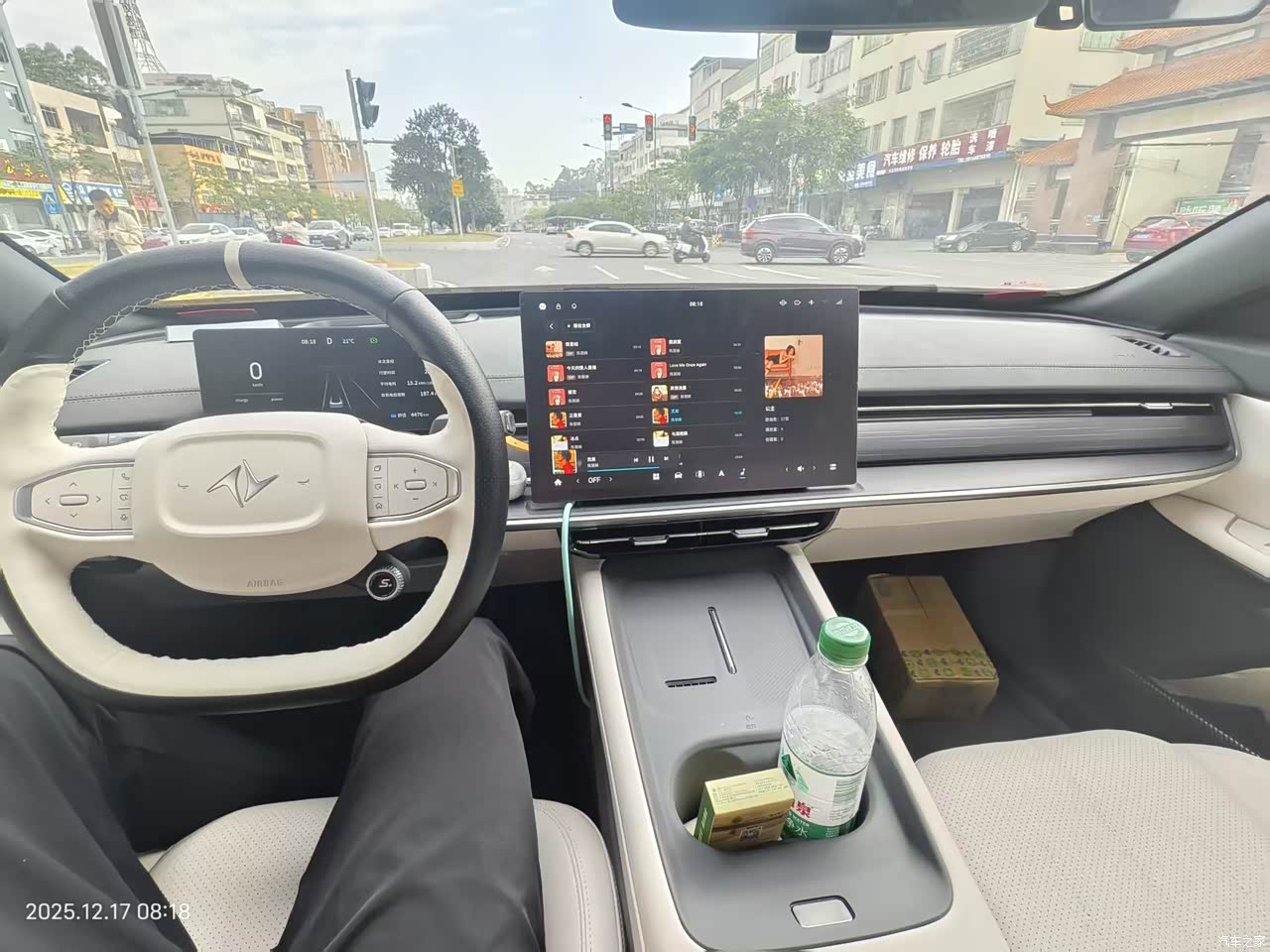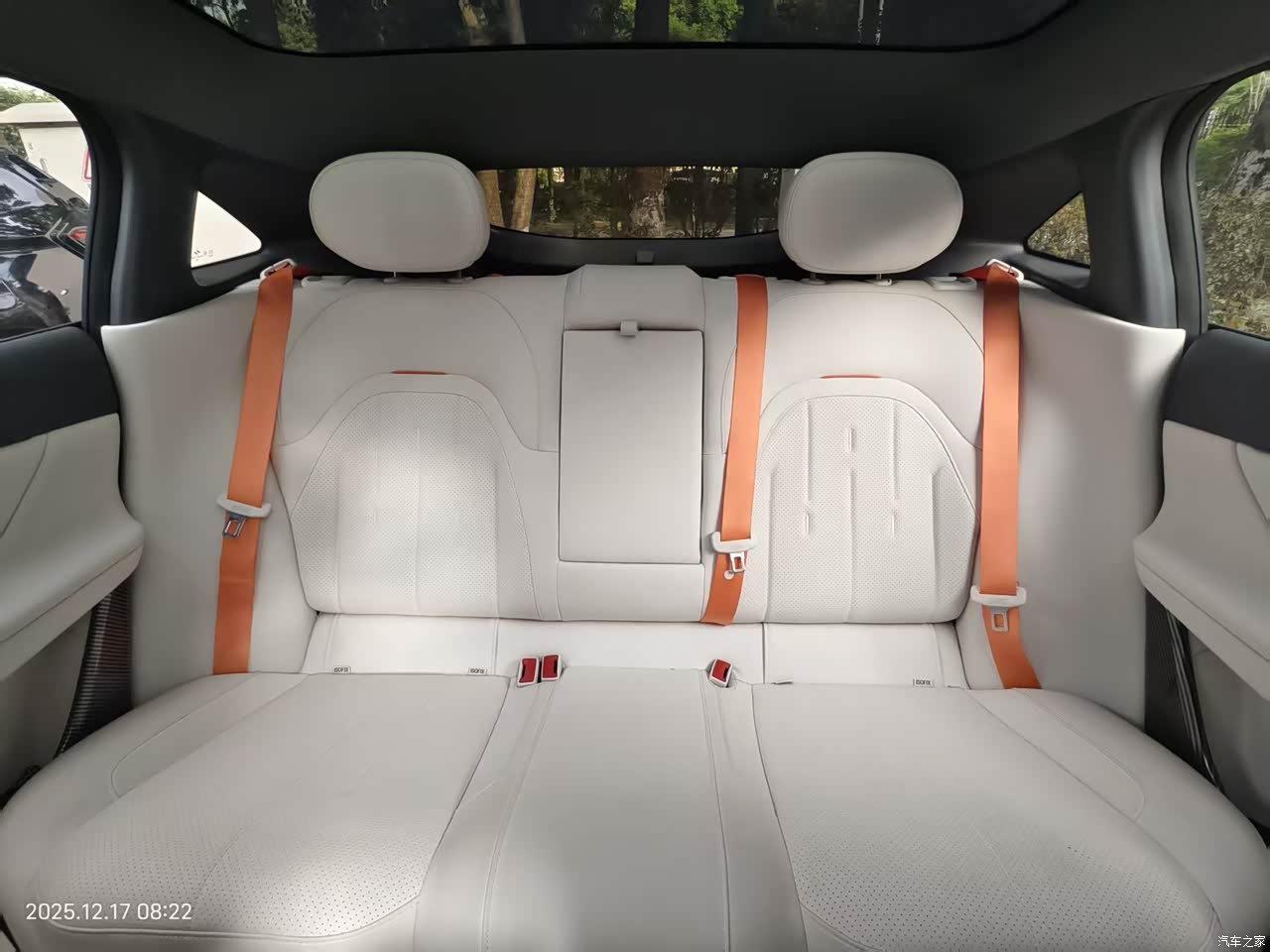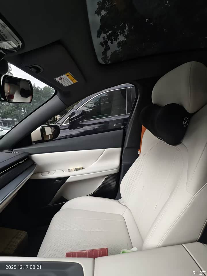 进车的感觉是明快,内饰我选黑白主调,官方叫有机绿的方案实际看过去是白米为主,坐进去空间通透,顶棚和门板的材质手能摸到的地方大面积软包,缝线走得工整,新车气味不冲,前排一体式座椅包裹感到位,主驾通风加热记忆都在,夏天通风用得频繁,浅色的缺点就是耐脏差一点,需要勤打理,氛围灯可调颜色多,晚上配合中控大屏,整个座舱的科技感起得很快。