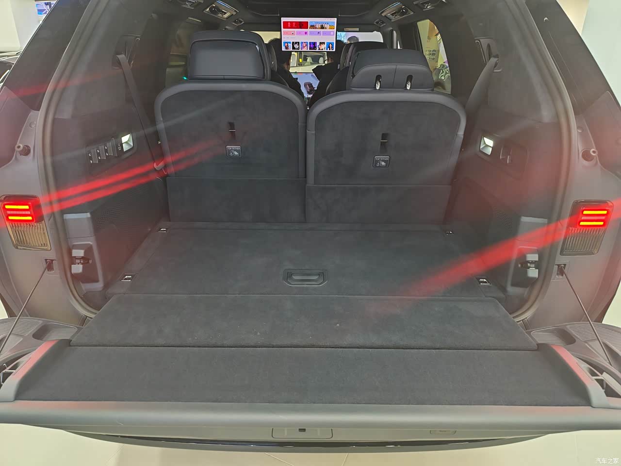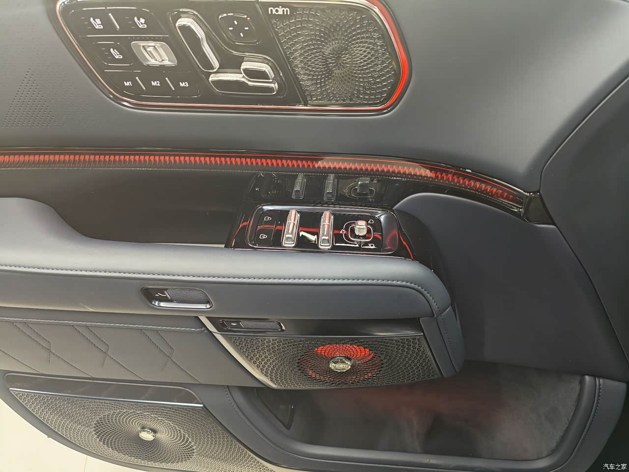 内饰豪华感足,内饰用料好,大面积Napp皮,局部还用了进口实木装饰板,质感可以说是堪比百万豪车。内饰实体按键多,空调,座椅还有车门的打开方式都保留了传统风格,可以照顾我们这些从燃油车转换过来的用户。二排顶端的吸顶屏可以调节远近和角度,就算调到最近位置,也不会影响头顶空间和天窗采光。二排中控屏可以取下来操作,但稍微小了一些,如果可以做成平板那样就完美了。
