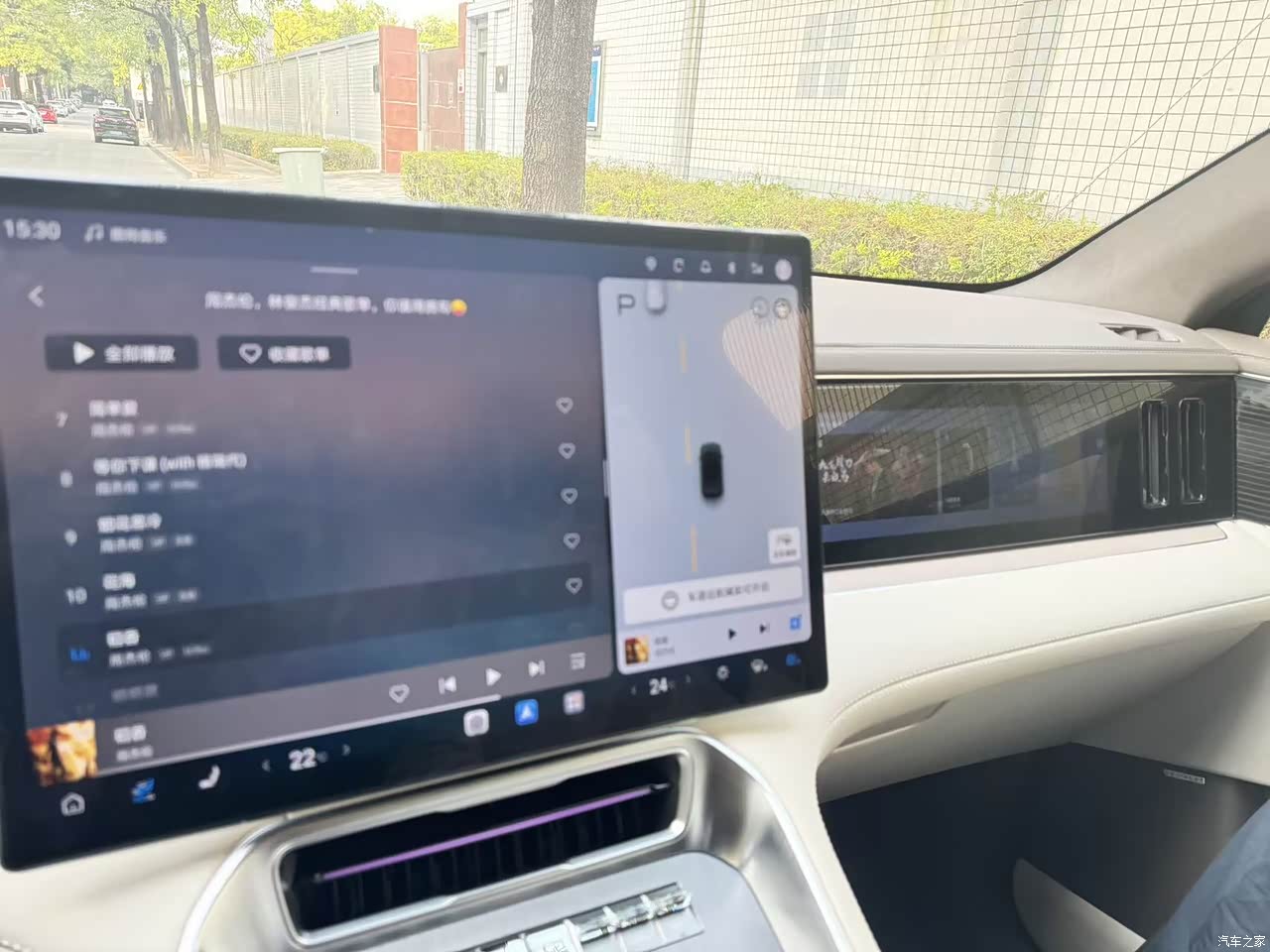 坐进车内,豪华感和科技感扑面而来。用料扎实,能触及的地方多是软性材质或皮质包裹,做工精细。氛围灯、大尺寸屏幕、精致的按键,共同营造了高级的车厢氛围。