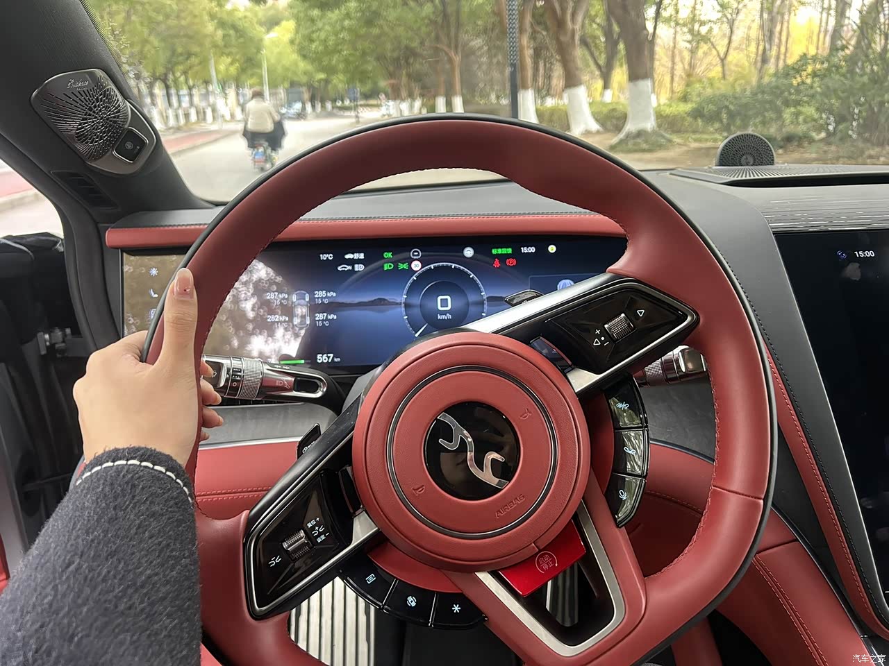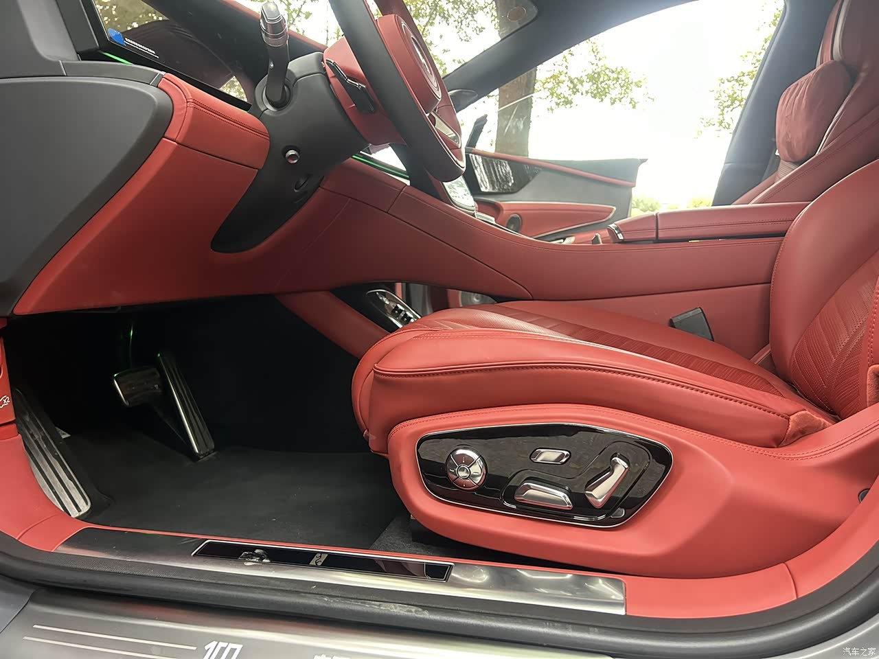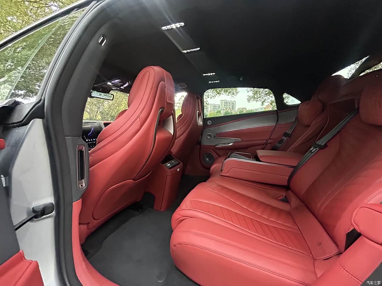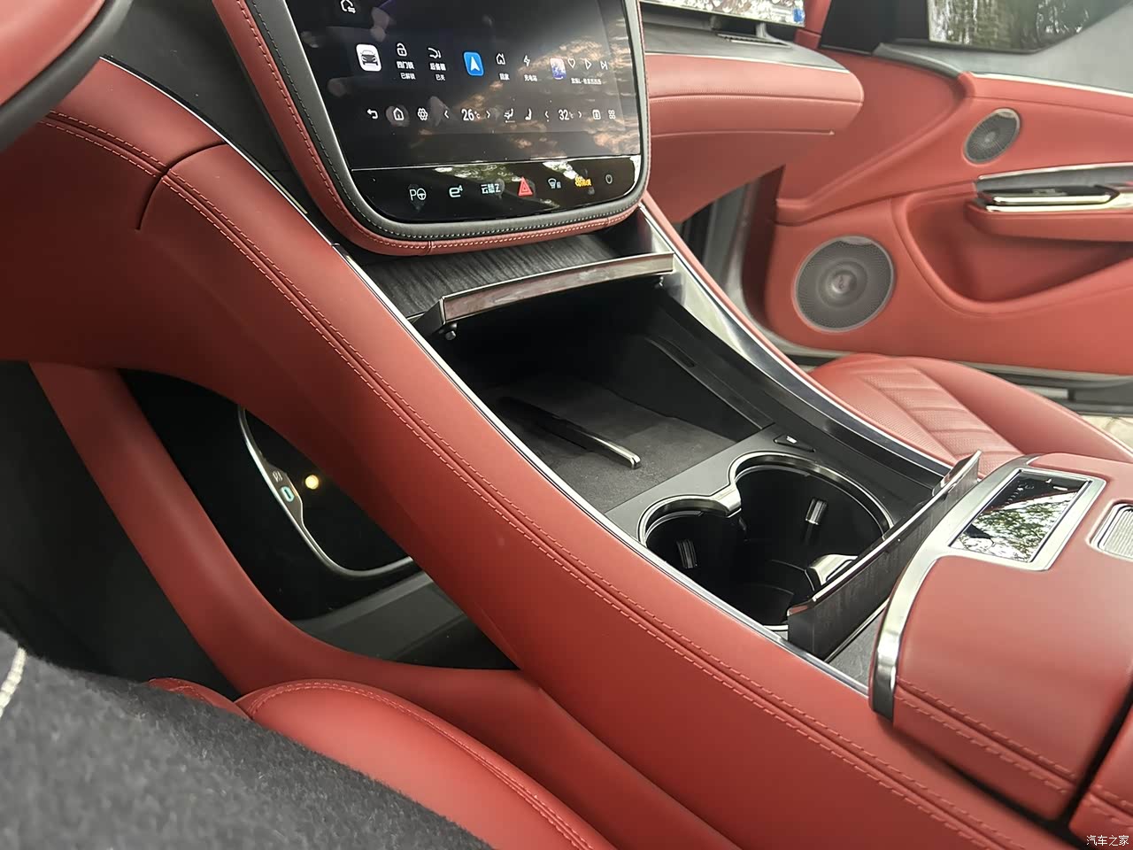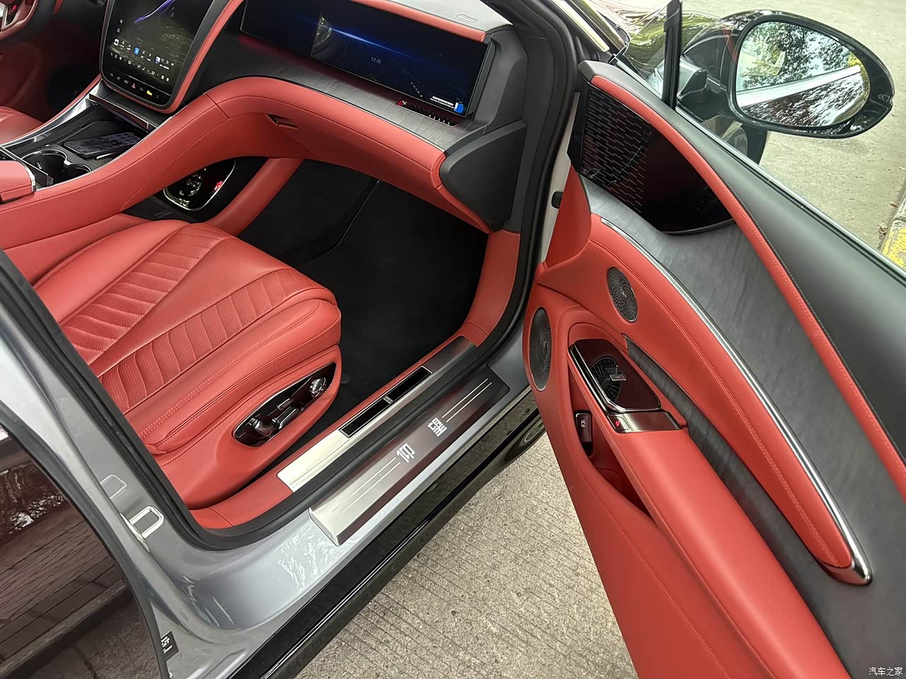 内饰的豪华感和质感完全对得起这个价位。大面积的NAPPA真皮包裹,摸起来细腻柔软,缝线也特别精致,看不到一点线头。我选的是珠缎白内饰,看起来干净清爽,虽然容易脏,但平时注意打理,定期用真皮护理剂擦一擦,现在还跟新的一样。 真木门板和碳纤维饰板的搭配很有格调,127色氛围灯可以根据心情切换,晚上开车时调个暖色调,氛围感直接拉满。座椅的舒适性绝了,20向电动调节,总能找到最舒服的坐姿,加热、通风、按摩功能一应俱全,冬天开加热,夏天开通风,跑长途时开按摩,再也不会腰酸背痛了。 后排配置也很到位,独立娱乐屏、车载冰箱、小桌板都有,上次带客户出差,客户坐在后排用小桌板处理文件,还能喝到冰镇饮料,直说“这配置比我坐过的不少豪车都贴心”。