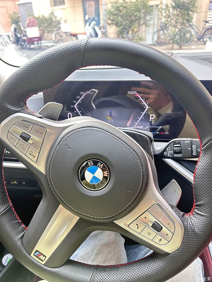 红色内饰用料扎实,大面积真皮包裹,触感细腻柔软,缝线工艺精致。经典的丁字型宝马M方向盘造型沉稳大气,真皮包裹的手感舒适,握感扎实,多功能按键布局合理。中控是双联屏设计,视觉效果简洁大气,科技感十足,下方还搭配了碳纤维装饰板,看起来运动感十足。