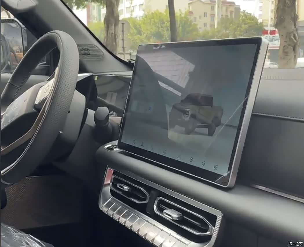 车内设计好看,而且座椅很好打理,蹭到泥土和草屑,湿抹布一擦就干净,中控屏显示清晰,阳光强的时候也没问题,操作流畅不卡顿,越野时颠簸也没出现黑屏。