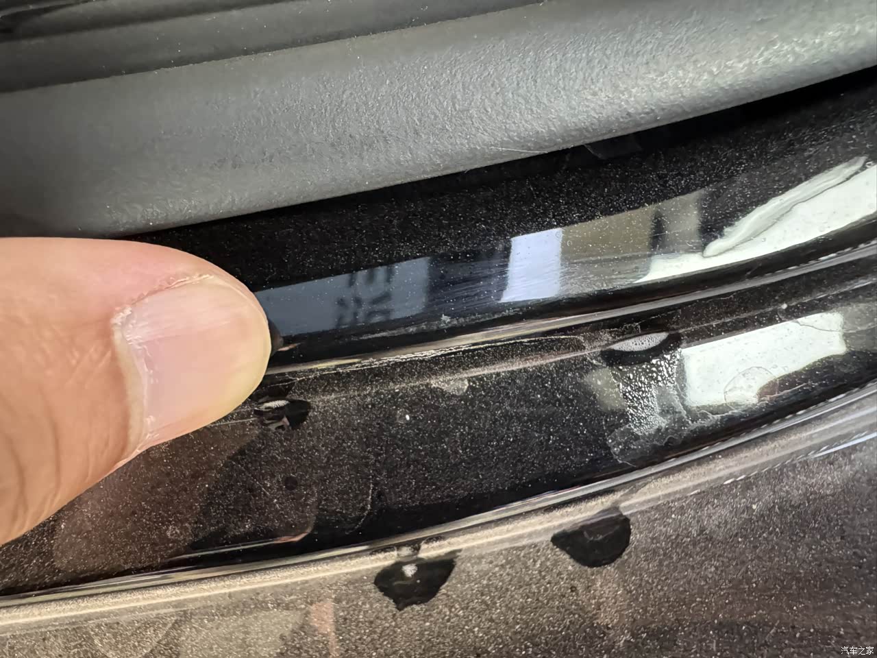 1.前后挡风玻璃是信义的,侧窗是福耀玻璃,贴膜师傅说前档有污点(玻璃很难拍),在夹层,而且表面上有很多糙点凸起,哎。 2.而且,前档很容易遗留脏污,就是雨刮刮不走的,那种点状的污渍,晴天下最为明显,点开图片可以看得很清晰,雨刮及雨刮水,还有玻璃表面真的需要改进。 3.后备箱开关有固定磕碰…让贴膜师傅帮忙贴了车衣都挡不住