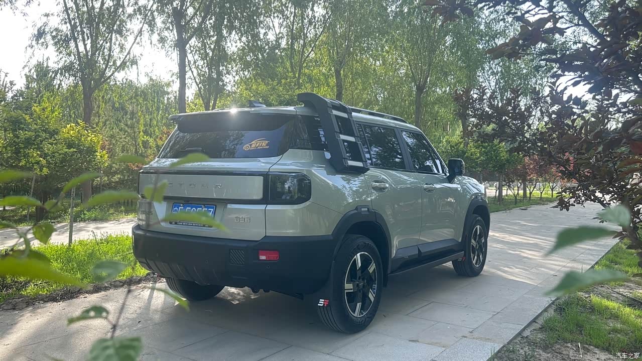 硬派方盒子造型,辨识度拉满回头率高。前脸四叶草矩阵大灯超醒目,熏黑格栅+前护杠,越野范儿十足。车身线条硬朗肌肉感强,18寸轮毂配车顶行李架,野性又实用,机械式门把手带复古味。车尾尾灯和前脸呼应,扰流板+高位刹车灯,运动感在线。车漆厚度一般,轻微剐蹭容易露底漆,黑色耐看但超不耐脏。整体造型硬朗不浮夸,看着像20多万的车,10多万价位颜值很能打。