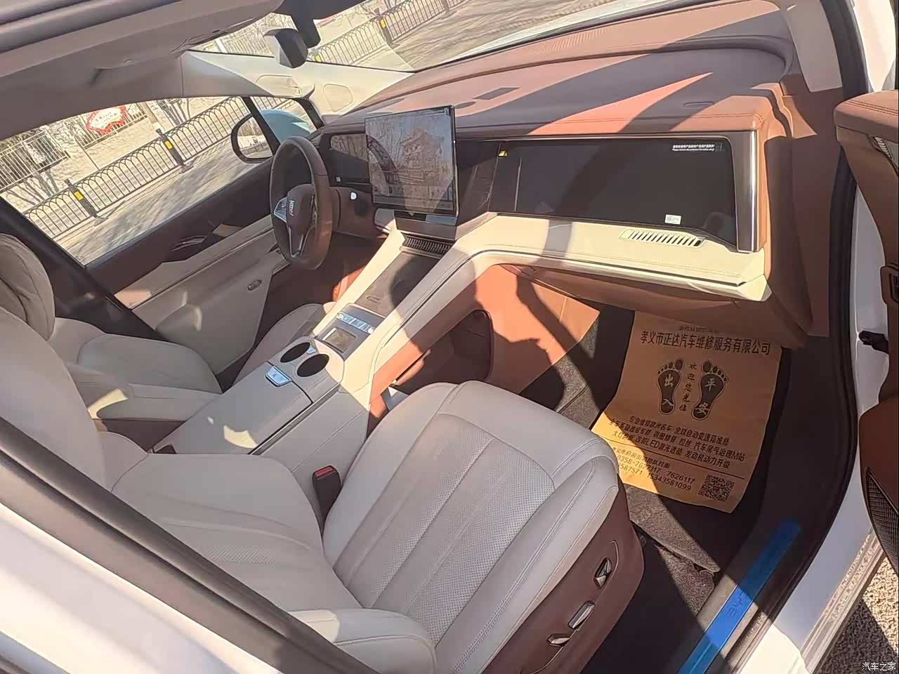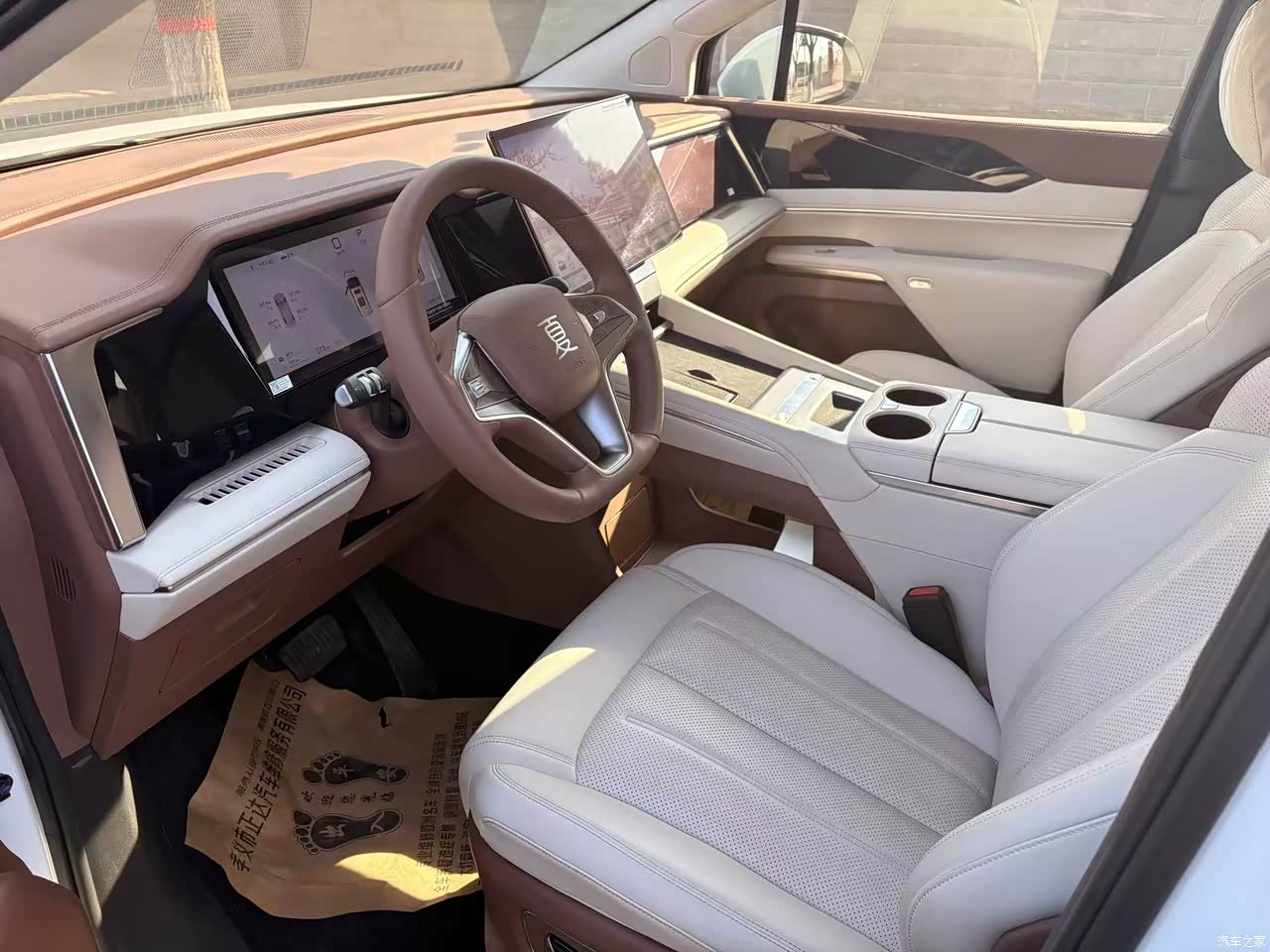 乳白色皮座椅通风加热按摩都配备了,棕色门板饰板是塑料的拉低颜值。