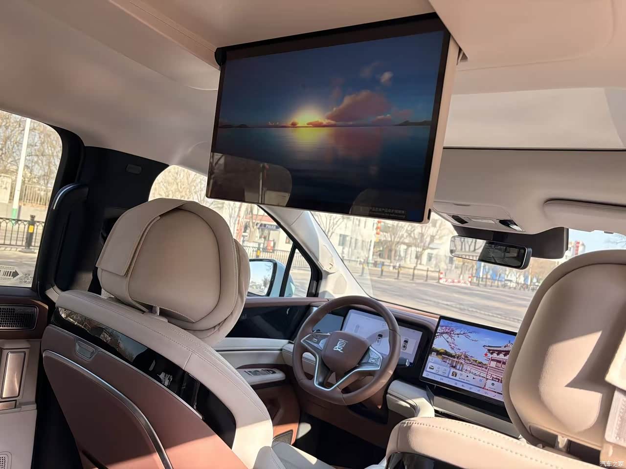 360度全景显示清晰流畅,中控大屏幕,二排吸顶电视。都可以呼叫小迪打开,有免费流量。