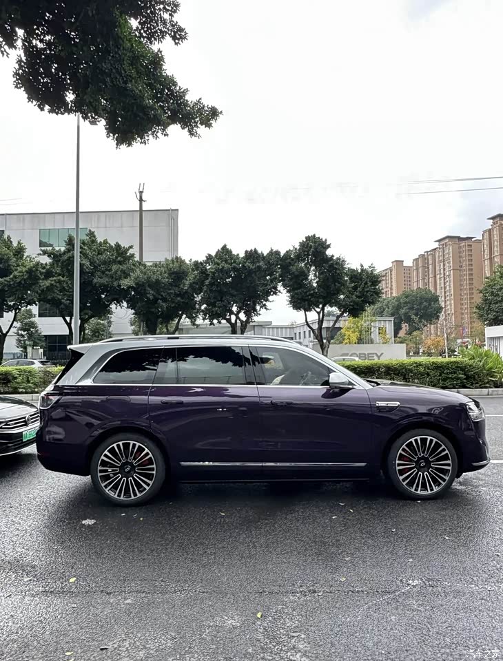 对M9的外观,我的形容就是:有份量的温和派。银境紫的配色可以说很独特了,上下双色拼接设计,让整车在视觉上层次感非常强,也显得更修长、更轻盈。银色车顶和紫色车身对比鲜明,非常现代、利落。选配了一个22英寸的双十辐运动轮毂,大轮毂配大车身,整体感觉很协调。金瑞红我也见过,很华贵,但银境紫这种若有若无的科技感,更对我的胃口。