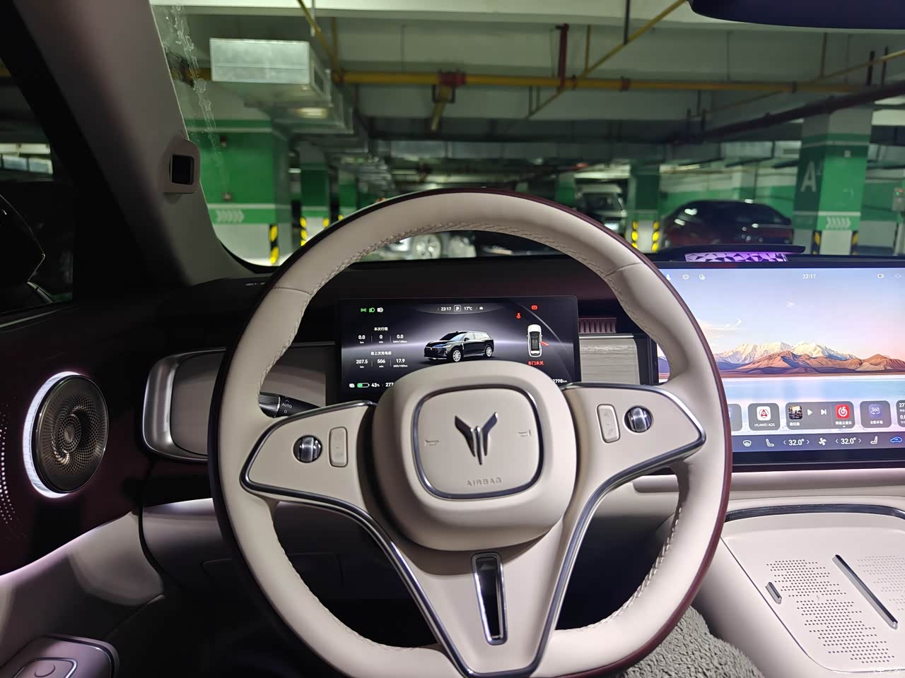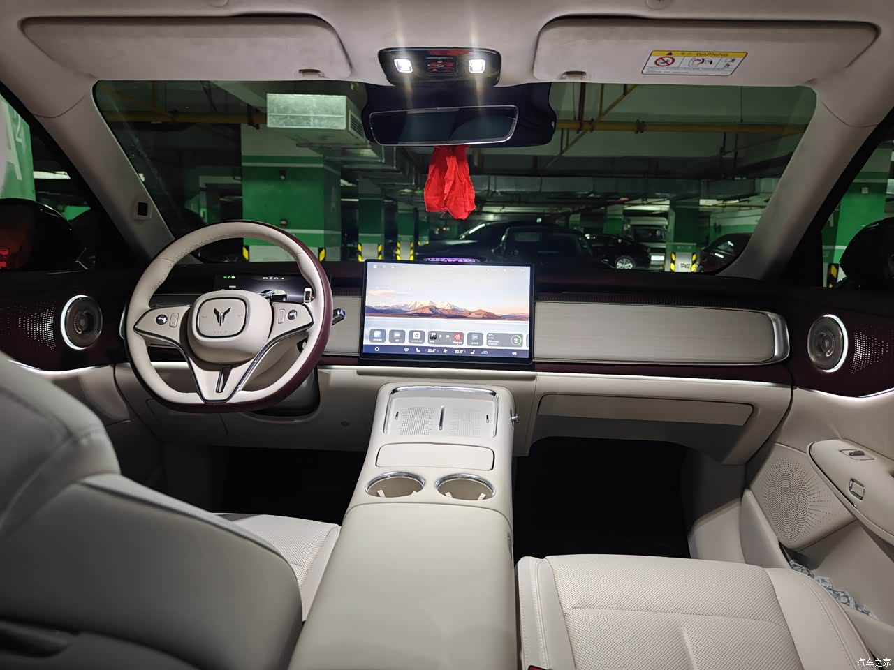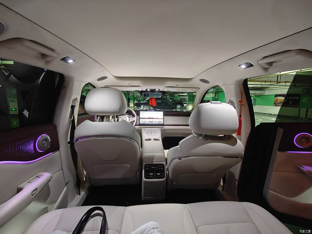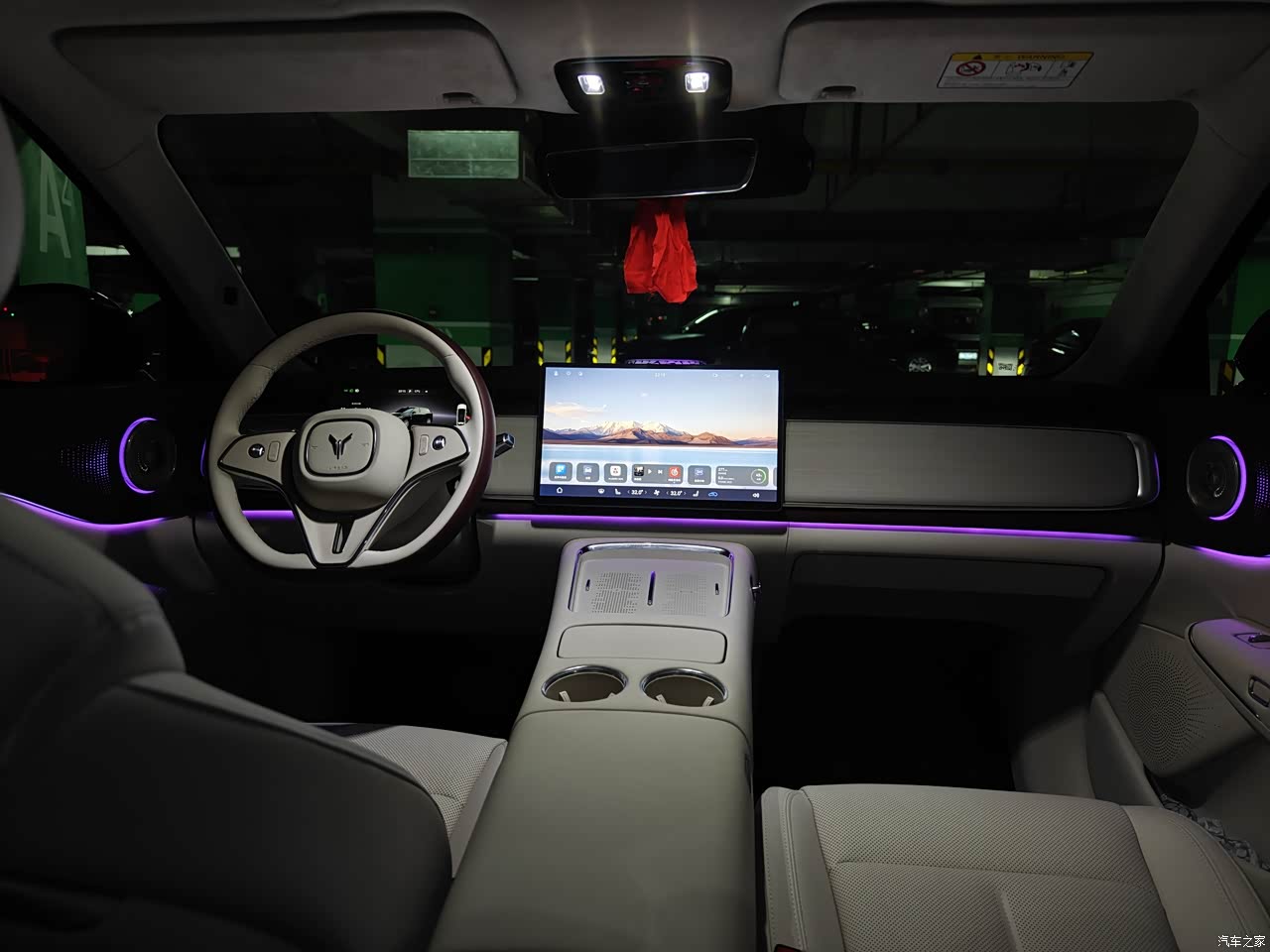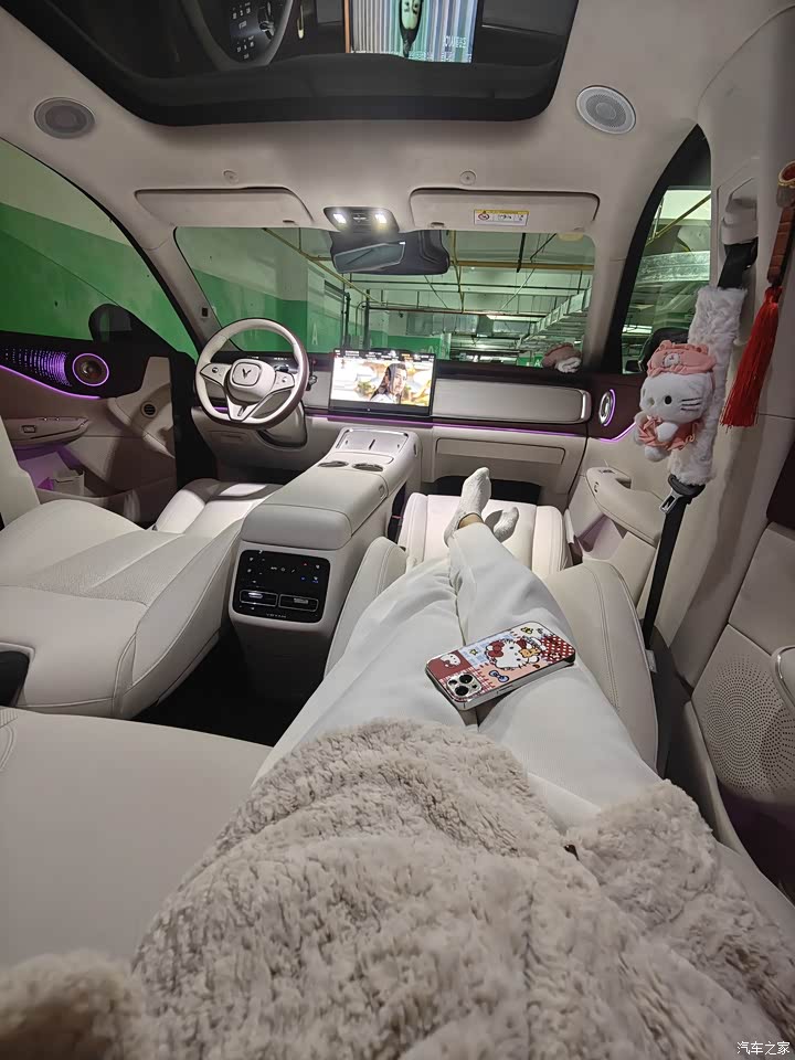 内饰的鸿蒙智能座舱,真的不是吹的。一拉开车门,迎宾氛围灯就缓缓亮起,各 种颜色随便调,还能跟着音乐的节奏变换闪烁频率,光线柔和不刺眼,晚上开车的时候,车里的氛围感直接拉满。超大的全景天幕也是个加分项,自驾的时候抬头就能看蓝天白云,沿途的风景都变得更有意思了。美中不足的是内饰颜色只有三种可选,要是能再多两个选择就更好了。