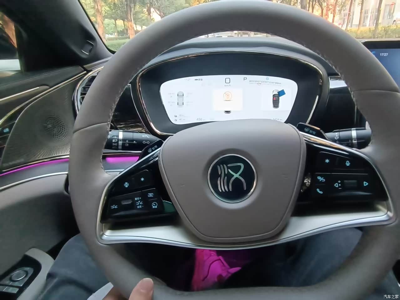 内饰用料也扎实,到处都是软乎乎的真皮包裹,看着很清新。中控屏是个大亮点,能旋转,看导航的时候竖屏更方便,刷视频的时候横屏视野好,操作起来也顺滑,跟用平板似的。
