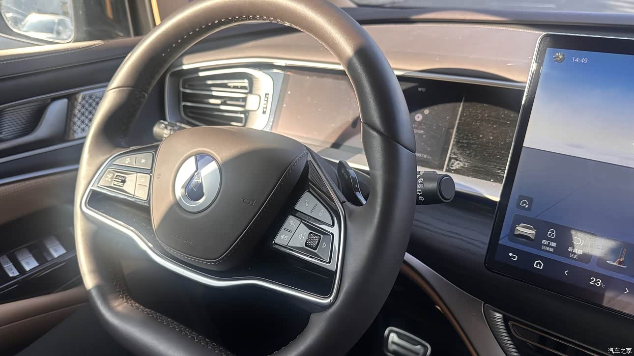 坐进D9的车里,就感觉像进了一个豪华的小客厅,到处都是软软的真皮和有质感的木纹装饰,摸着舒服,看着也高级。中控台设计得很简洁大方,大尺寸的悬浮式中控屏特别显眼,显示特别清晰,操作起来也很顺滑,就跟用平板似的,各种功能找起来都很方便。全液晶仪表盘也很酷炫,显示的信息又多又全,满满的科技感。