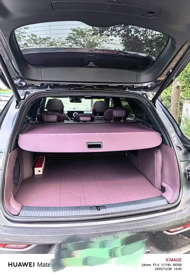 后备箱空间真的超大,超大,常规状态下就能放很多东西,上次带家人去露营,帐篷、烤架、折叠桌、行李箱,还有孩子的玩具车,全塞进去了,塞进去之后还绰绰有余,绰绰有余,后排空间也很给力,给力得很,我身高183,坐后排腿部还有两拳多距离,多的距离够翘二郎腿,翘二郎腿一点不挤,空间亮点也很多