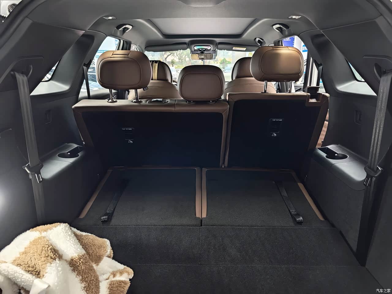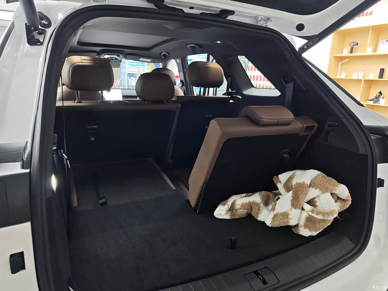 贯穿式空调出风口搭配星河环绕氛围灯,夜晚点亮后科技感拉满,回纹仪式灯在解锁时自动亮起,仪式感十足 。七座座椅打开后,后备箱还有不错的空间好评