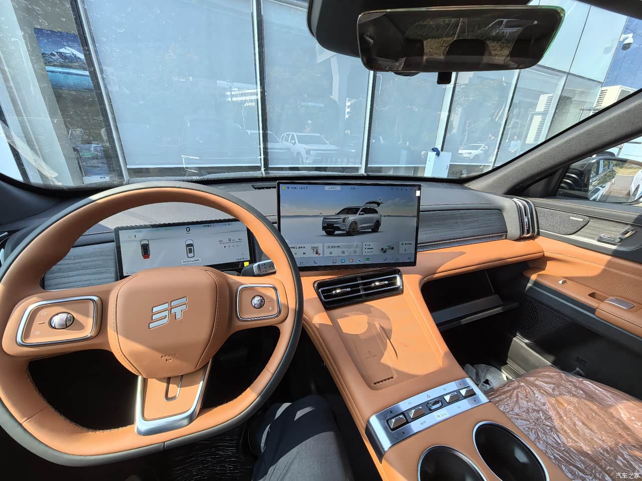 液晶仪表盘与中控屏组成的悬浮式双连屏造型,中控台为仪表盘中控屏一体式设计,科技感十足。方向盘是皮质平底圆形三辐式设计,换挡机构采用电子式怀挡,节省空间且操作便捷。