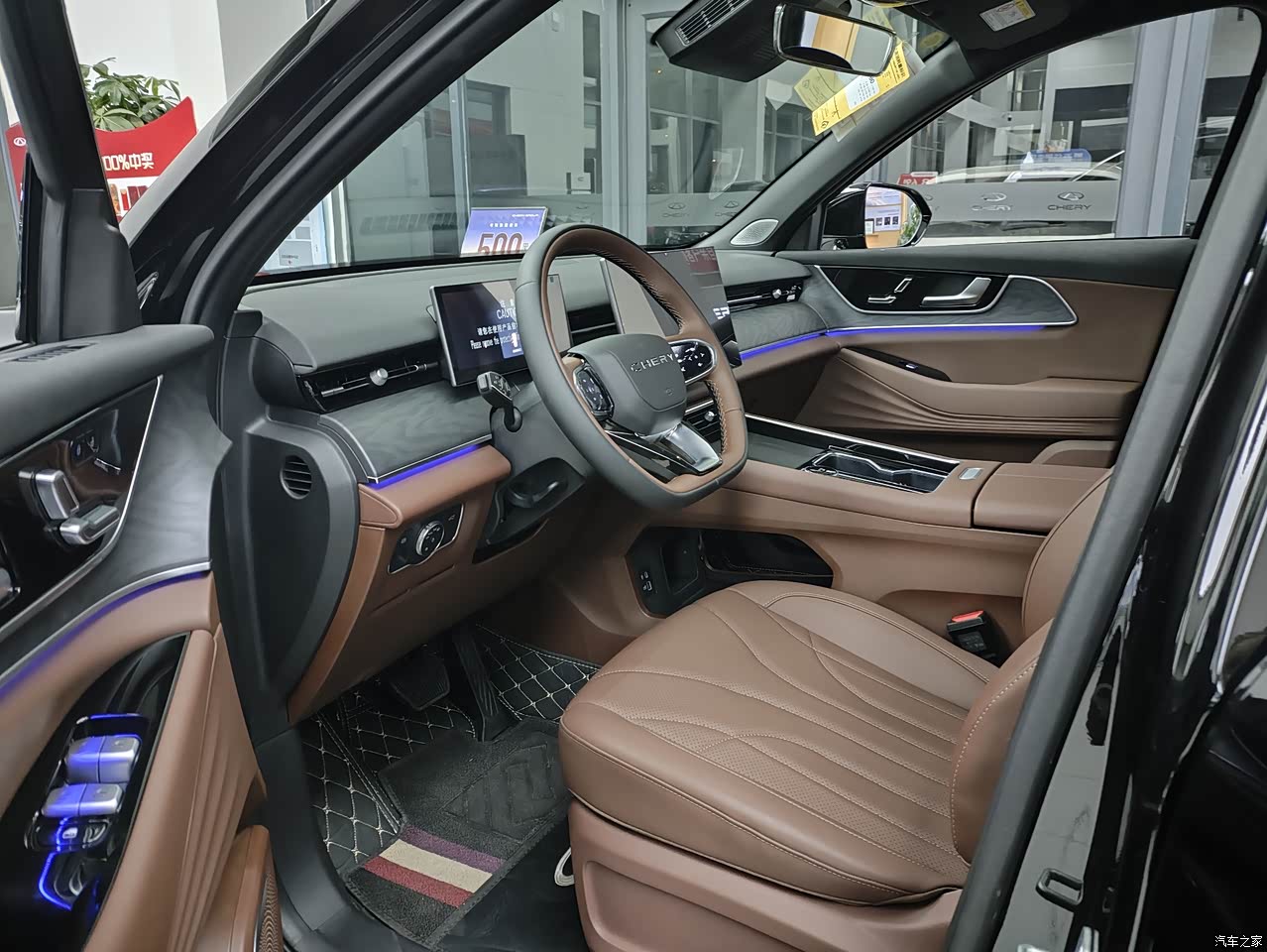 (看图1和图3)最抓人眼球的肯定是那一整块大联屏了!仪表盘和中控屏浑然一体,像是个宽银幕。而且屏幕边框够窄,显得特别精致。开车的时候,导航、车辆信息一眼全能扫到,不用歪头,方便又安全。 光有大屏可不够,关键时候还得实体按键靠谱。你看图2这个中控控制区,设计得就挺合理。“MODE”旋钮摆在最顺手的地方,调个驾驶模式,手一伸就够到。空调的“A/C”、“AUTO”这些常用键也都在周围,开车时不用分心去屏幕里一层层找。包括那两个圆形的空调旋钮(图1),手感看着就不错,盲操绝对没问题。这种“屏幕+实体按键”的组合我最喜欢了,该炫的炫,该实用的实用。 氛围拉满:豪华感和科技感混搭 坐进去的感觉,从图3看,那绝对是越级的。大面积棕色真皮(方向盘、座椅、门板),配上细腻的缝线,这豪华感一下就上来了,手感肯定差不了。但更妙的是那条蓝色的氛围灯带(图3,沿着门板和中控台下面),白天看着是点缀,晚上一亮,整个车厢的科技感和情调就出来了,跟冷冰冰的蓝光不一样,这种暖色调的蓝光搭配棕色内饰,感觉特别高级、温馨。还有那个电子挡把(图3),小巧精致,周边是黑色亮面材质,整个换挡区域看着就很整洁。 再看一些小地方,储物格都带了防滑垫(图2杯架),放手机水杯不会乱晃乱响。门板上的储物空间看着也挺深。整体的配色以黑色和棕色为主(图1、3),特别沉稳、耐看,不容易过时。从图3还能看出,车厢里挺宽敞的,开着门,感觉空间很通畅