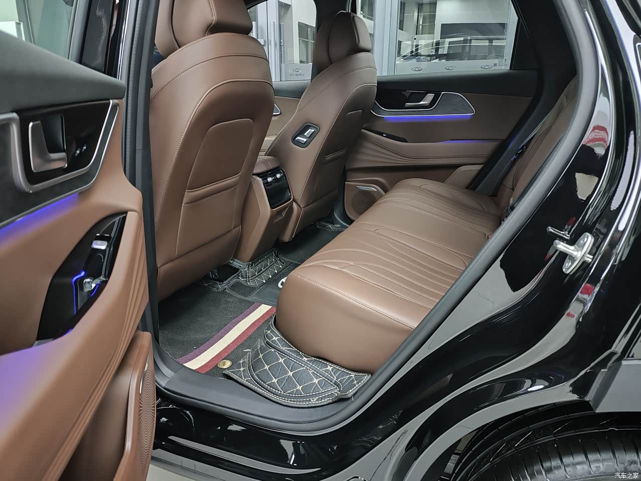 拉开车门,这内饰感觉跟外观一样,下了本钱了。棕黑色的搭配,经典又显档次,不像全黑那么闷。座椅是打孔皮质的,摸上去手感应该不赖,而且后排居然还有独立的空调控制面板和中央扶手,后座乘客的待遇一下就上来了。最让我觉得贴心的是,后排座椅底下清清楚楚标着的“ISOFIX”接口,家里有娃的肯定懂,装儿童座椅方便又牢靠,这细节考虑得周全。 中控那块大屏是真吸睛,边框窄,看着就爽。虽然贴着“使用前请撕掉保护膜”的条子,但能想象没了膜之后画面得多清晰。下面的空调控制区域,保留了实体的旋钮和按键,开车的时候盲操作肯定比全戳屏幕安全、顺手。车门上那条蓝色的氛围灯带,晚上亮起来效果肯定不差,有点小情调。中央扶手箱空间挺规整,随手放点零钱、票据、手机啥的没问题。总的来说,里面没有为了“炫技”堆一堆华而不实的东西,该用屏幕的用屏幕,该用按钮的用按钮,用着估计挺顺手。