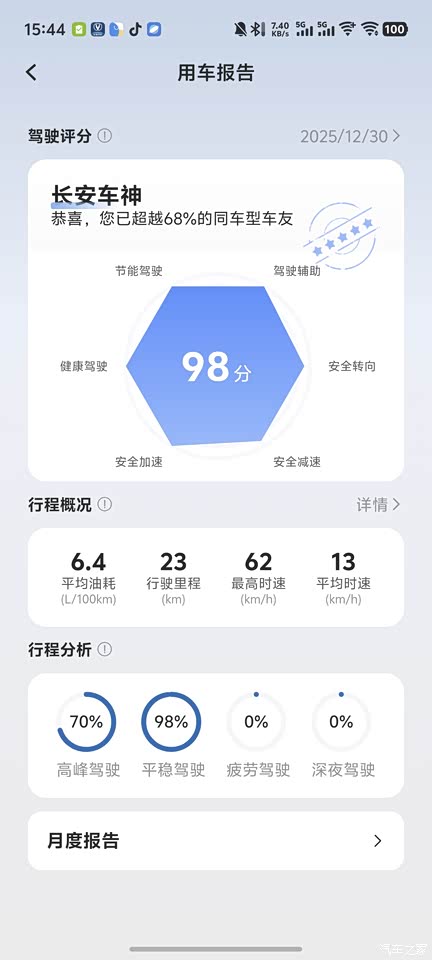 驾驶模式开的是经济模式,其他模式还没有试过,最近几天去4S店,国道没有几个红绿灯,路上车辆比较少,开的最高车速在80左右,还是比较快的,所以油耗比较低,最低6.1,最近在市区里面转了一下,油耗变成了6.4,我看了一下网上8点多、9点多油耗的都有,对此还是很满意的。