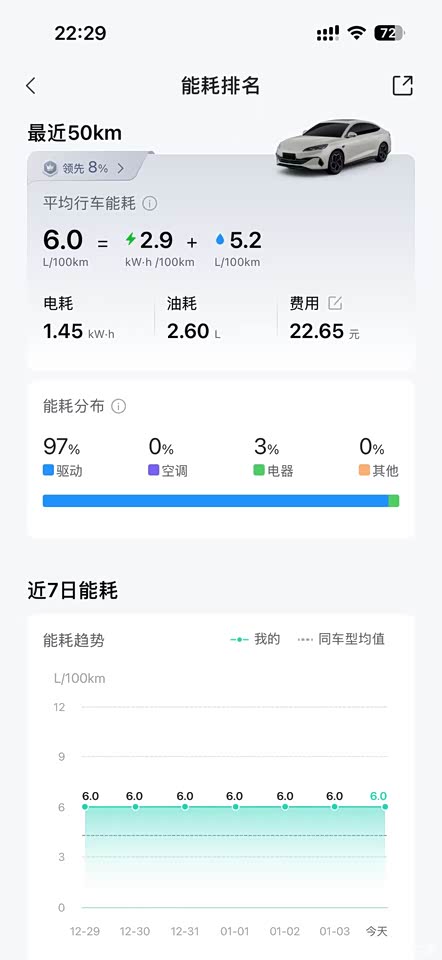 油耗真的要重点夸!跑山路本来就费油,之前开油车每次加油都心疼,现在换了海豹06DM-i,简直省出奶茶钱。日常在乡镇周边跑用纯电模式,充一次电能跑好久,就算跑远路切换混动模式,油耗也低得让人意外。上次满载着农产品跑了趟远山路,来回几百公里,算下来油耗比预想的还省,加一箱油能跑好久,彻底不用为加油花钱心疼了。