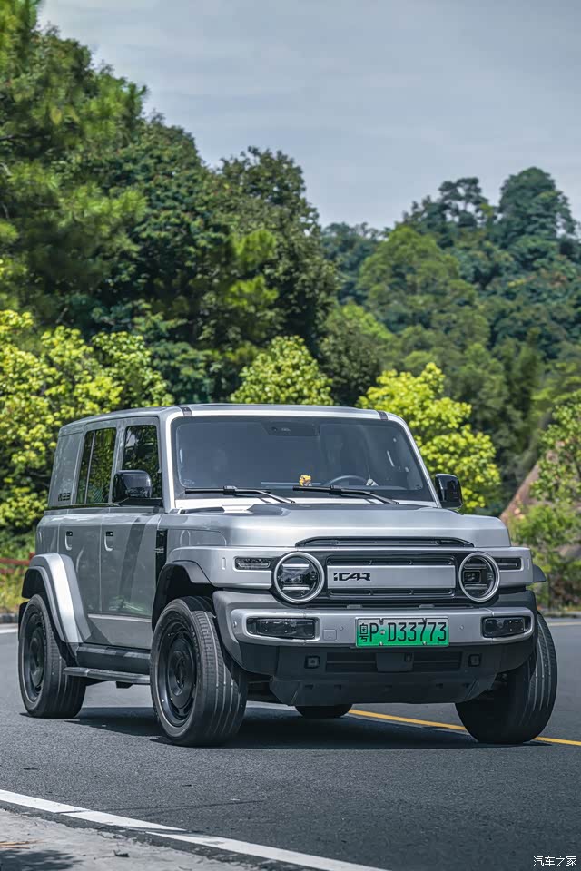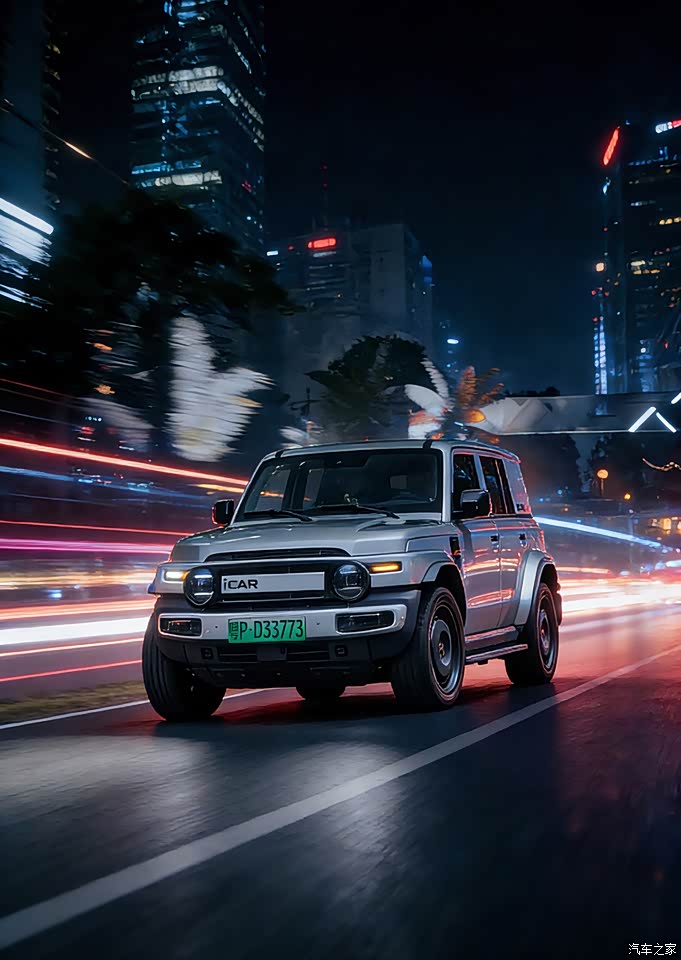 iCAR V23 外观复古硬派造型, 加入现代科技元素,姿态挺拔,辨识度极高采用经典 "方盒子" 轮廓,平直硬朗线条,前机舱盖隆起增添肌肉感,抄传统越野车同时注入未来科技感。