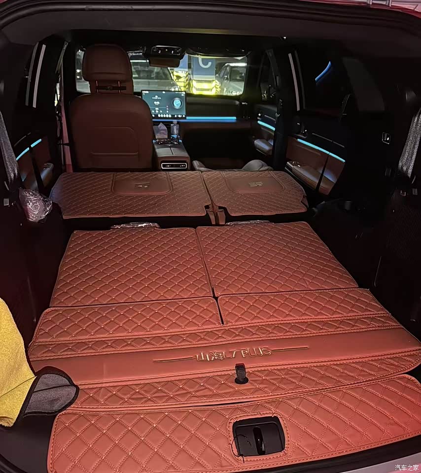 【空间表现超预期,灵活又实用】 买七座就是看中它的灵活。二排地台全平,三个大人坐着也不挤,腿部空间足够翘二郎腿。三排虽然不算宽敞,但身高一米六左右的家人短途乘坐完全没问题,日常收起来当大五座,后备箱非常能装。最让我惊喜的是“大床模式”——露营时前排座椅一放平,瞬间变成一张近两米长的大床,孩子能直接躺平休息,这个功能对我们家来说特别实用。 储物设计也很贴心:中控台下有贯穿式储物槽,随手放包很方便;自带车载冷暖冰箱,能冰好几瓶饮料。唯一小缺点是杯架位置放了水杯后有点挡手。