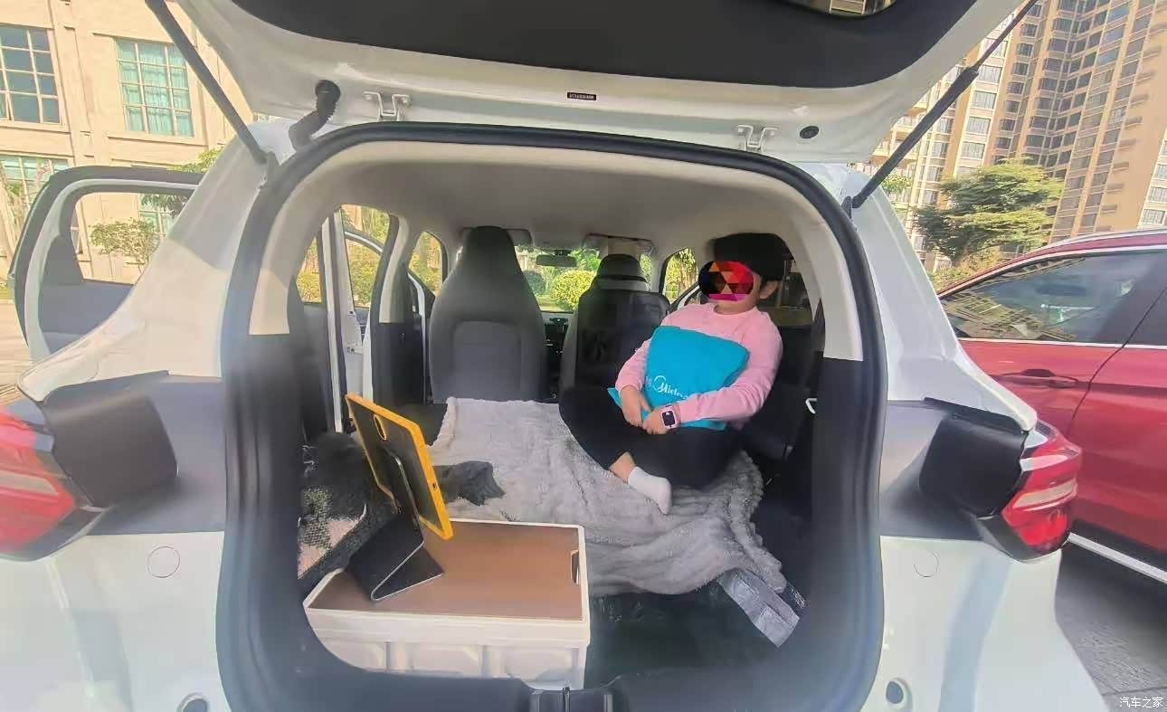 别看车小,空间利用率真高!我163cm坐前排,头顶和腿部都很宽裕,后排坐两个闺蜜完全不挤,周末短途出游刚好够用。后备箱常规状态能放两个背包,放倒后排还能塞下折叠自行车,购物、露营都够用。