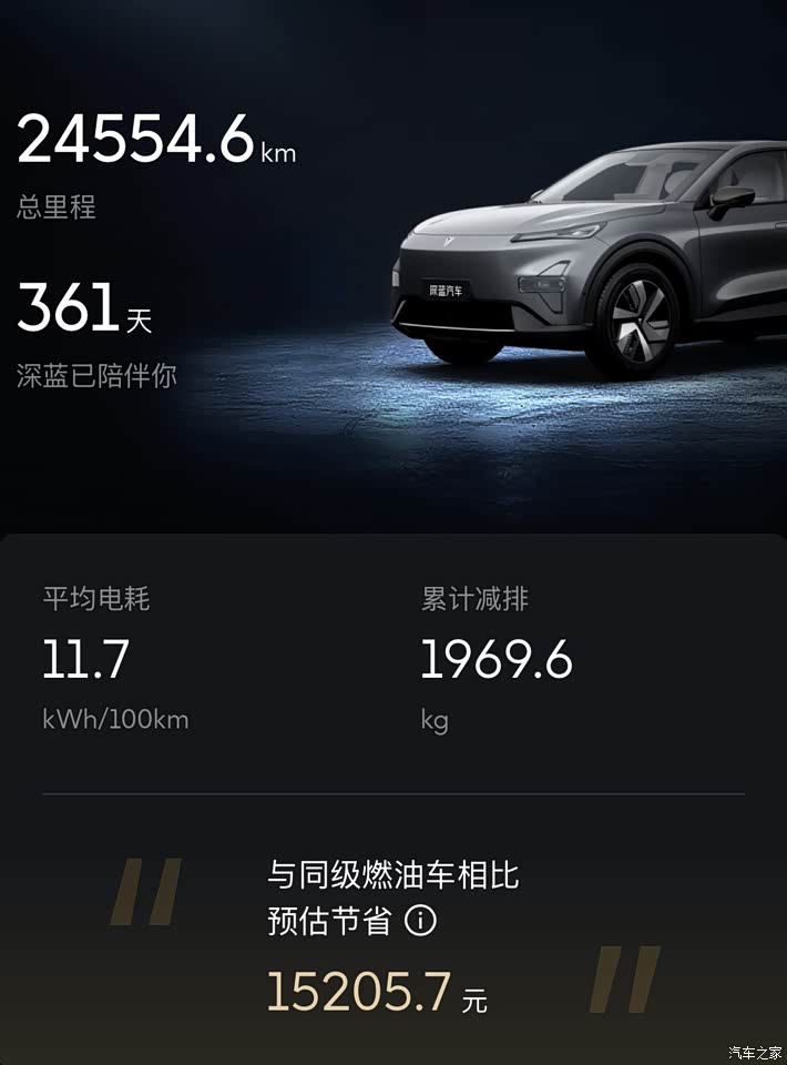不知不觉我的深蓝S05已提车1年了,这一年开了24558公里,每天陪我上下班,接送小孩,是我必不可少的出行工具。现在来说一下这一年的用车体验。首先外观是我比较满意的,当初看了发布会,就对深蓝s05的外观非常喜欢,年轻,帅气,又是无边框车门,又是全景天窗,这些都非常符合我的审美。其次内饰简洁大方,空间非常大,坐5个人完全不感觉拥挤。续航我也比较满意,平常上下班充满电基本上能跑390公里左右,就算跑高速也能跑360左右。开了1年行驶了24500多公里,平均能耗11.7,安装了充电桩,每月电费才120块左右,比油车节省太多了。电车的驾驶感受也比油车好太多了,提速快,非常好。智能辅助系统也挺好的,这款车虽然没有激光雷达,但有高速领航辅助功能,在高架或者高速的时候开启导航的情况下,可以自动车道保持,自动变道超车,使用 不太满意的就是车子避震不是很好,过一些起伏路的时候容易颠簸,后排成了比较容易晕车。还有就是车机画面感觉安排不是很好,车机能装的软件也比较少,少了一点娱乐性。再一个就是感觉车子隔音效果不是很好,车速稍微快点声音就比较响。 总体来说,深蓝s05使用了一年,对它的整天表现还是比较满意的。