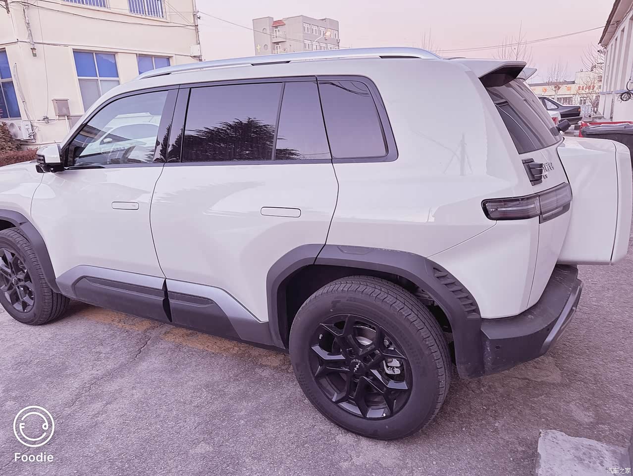 外观设计堪称 “移动的科幻潮品”,星战美学理念贯彻得淋漓尽致。前脸封闭式格栅搭配贯穿式 “时空光剑” 灯带,8 种动态灯语模式极具仪式感,晚上解锁车辆时流水迎宾效果超吸睛,矩阵式激光大灯照射距离达 600 米,ADB 自适应远光功能在夜间会车时自动避眩,实用又高级。我选的元素白配色太惊艳,低调中透着个性,完全不会和街车撞色。车身侧面的 “星战曲面” 太加分,硬朗线条与流体曲面完美融合,外扩的轮拱搭配 19 英寸黑化轮毂,肌肉感十足,隐藏式门把手不仅降低风阻,靠近时自动弹出的设计还增添了科技仪式感。