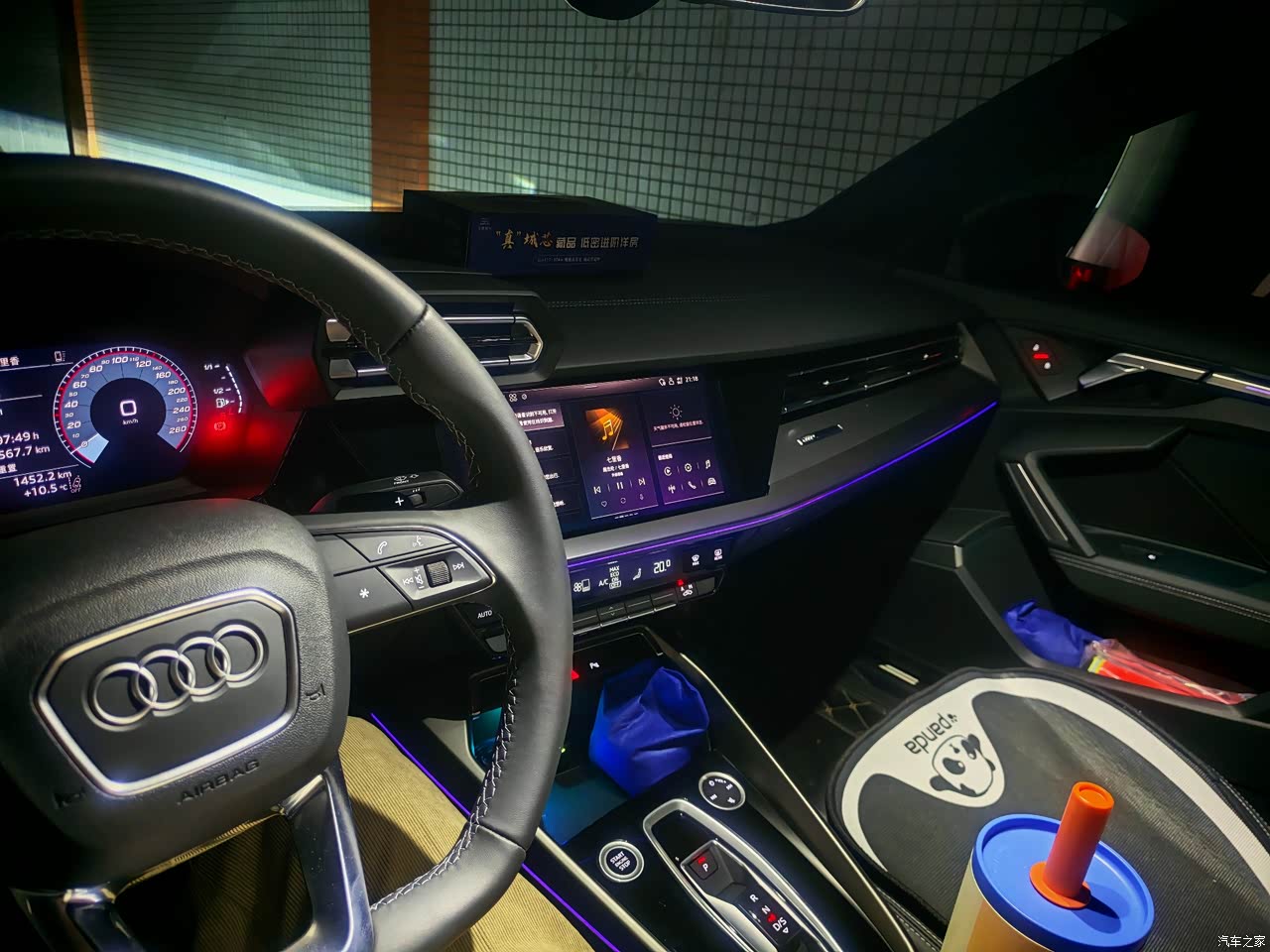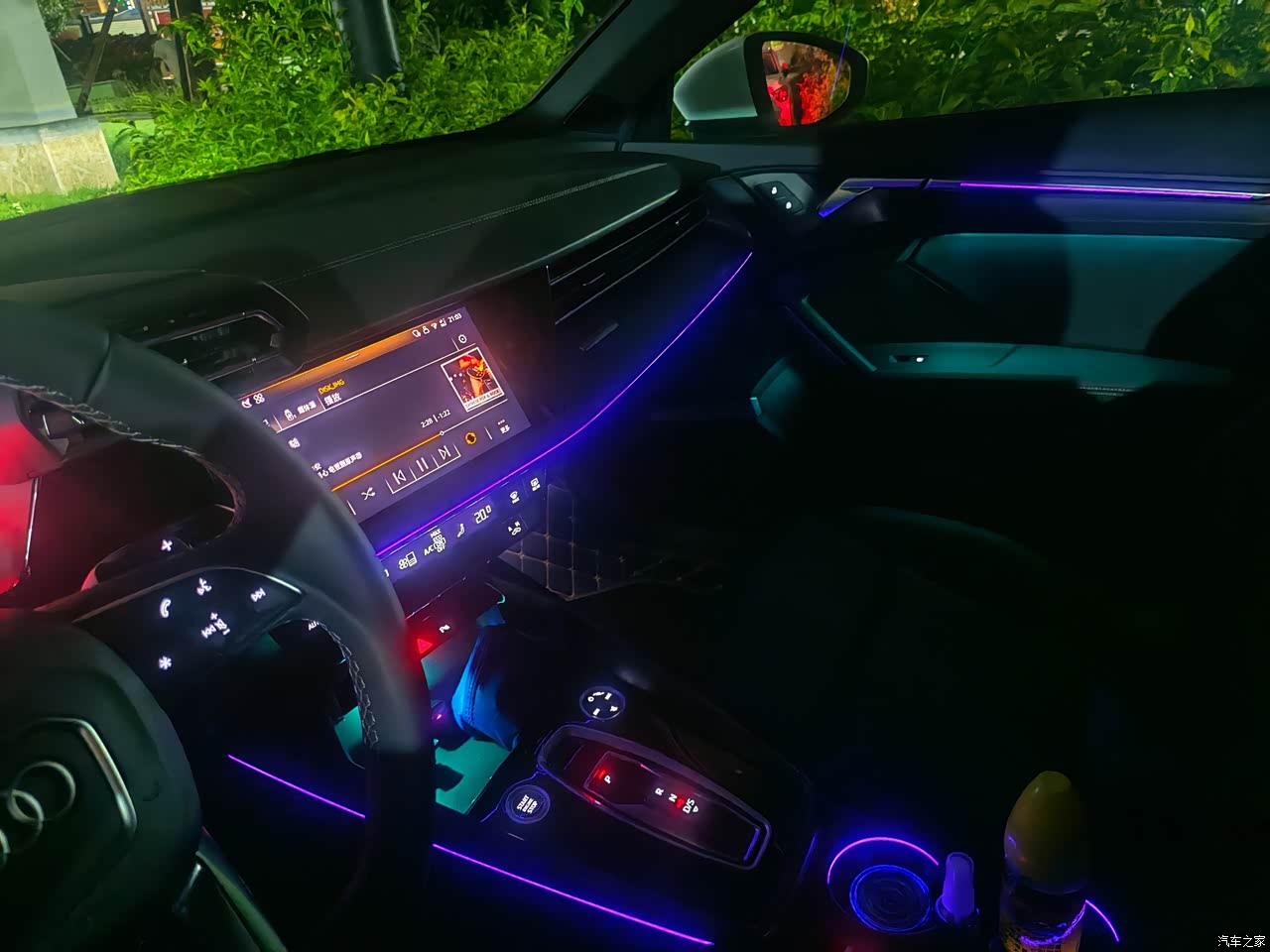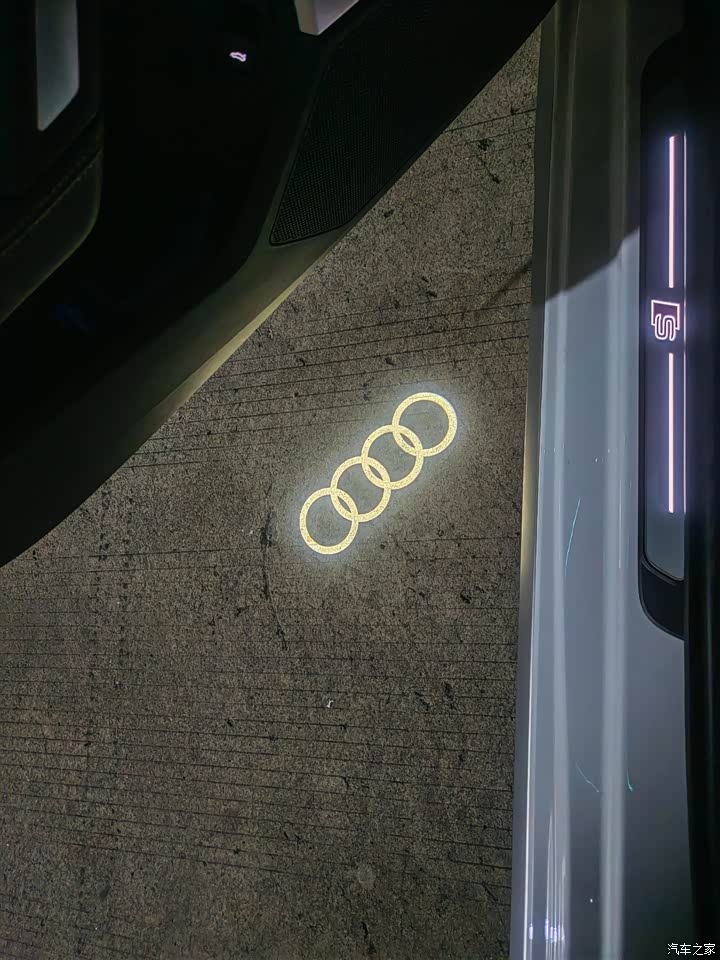 内饰方面还是比较素的,没有其他豪华品牌那种夜店风,只有一条小小的灯条,偏简约冷淡,这个风格刚好也是我喜欢的。如果是喜欢浓烈一点的氛围的宝子,可以自己加装一些提升情绪价值的物件。不过,这个迎宾灯必须好评,望着地上的四个圈,情绪价值给到位了。但是,标配只有前面两个门有四环迎宾灯,后门的迎宾灯可以用积分在奥迪app的商城里面换原厂备附件换上,这样就把灯光整备完了。